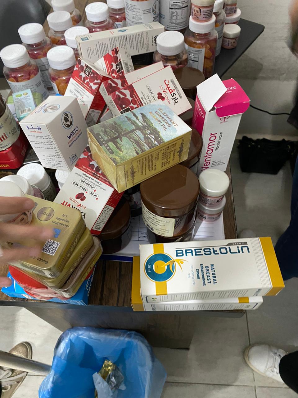 كما تم تحريز بعض الأدوية والفيتامينات للفحص من قِبل هيئة الدواء المصرية.