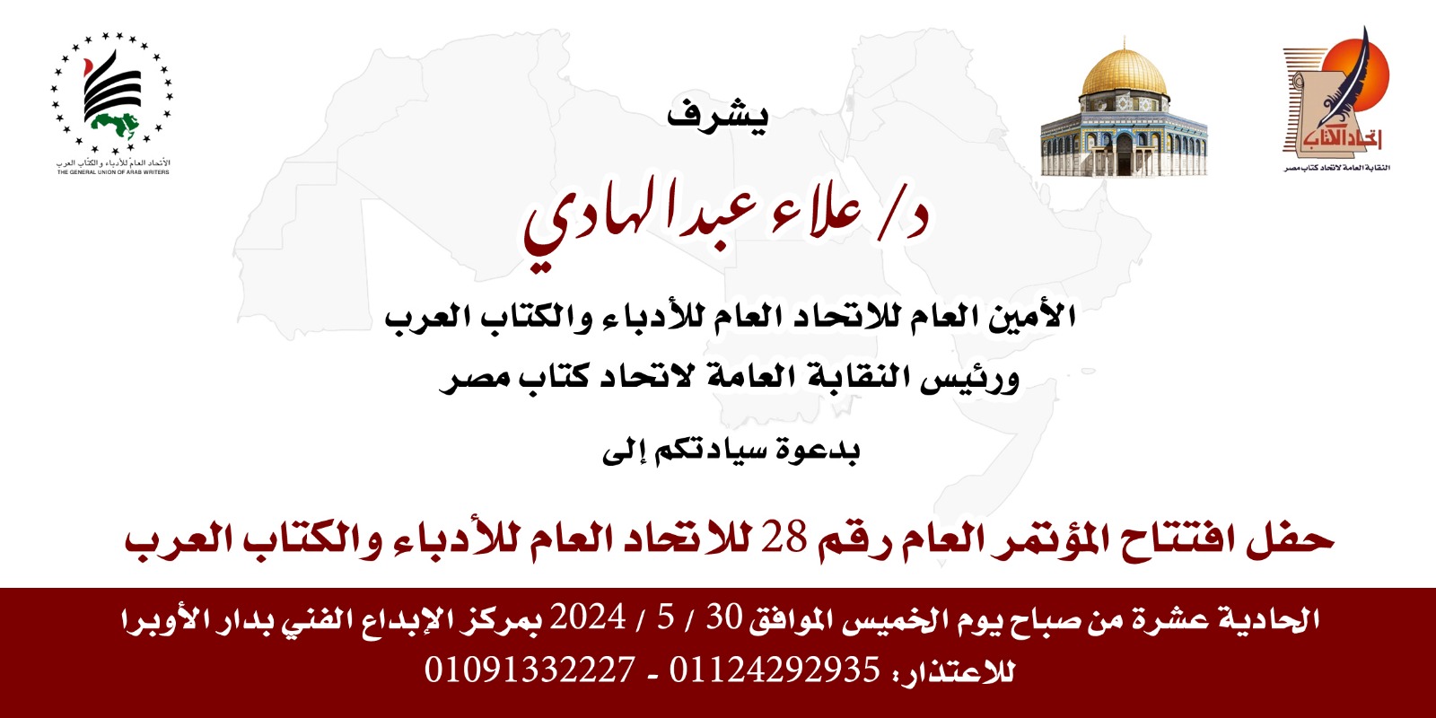 يقيم اتحاد الكتاب والأدباء العرب بأمانة الدكتور علاء عبد الهادي المؤتمر العام لاتحاد الأدباء والكتاب العرب.