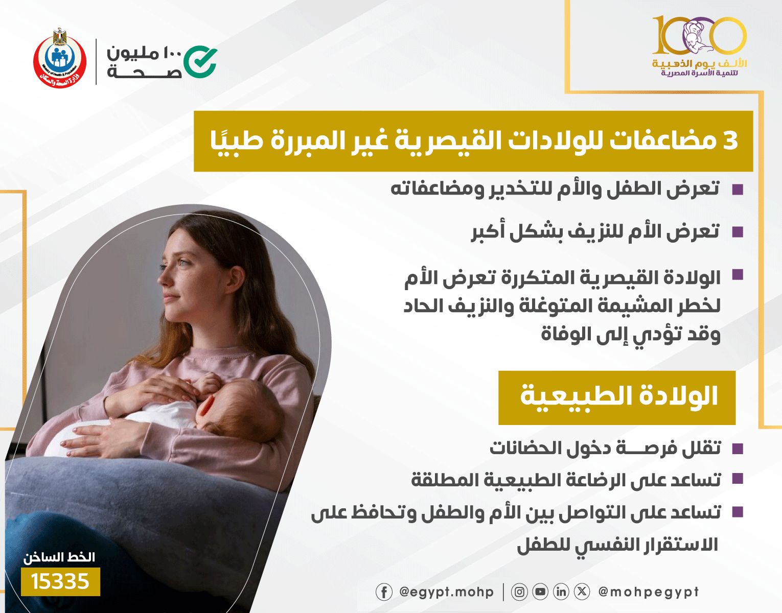 وأكدت الصحة أنها تستهدف انخفاض معدل الولادة القيصرية من ٧٠% الى ٥٠%.