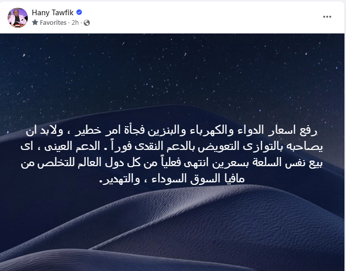 وقال الخبير الاقتصادي هاني توفيق، عبر منصة "أكس"، عن الدعم: "رفع اسعار الدواء والكهرباء والبنزين فجأة أمر خطير، ولابد أن يصاحبه بالتوازى التعويض بالدعم النقدى فورًا".