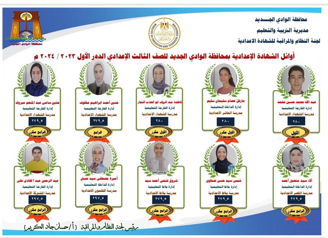 أسماء الـ10 الأوائل بالشهادة الإعدادية في الوادي الجديد