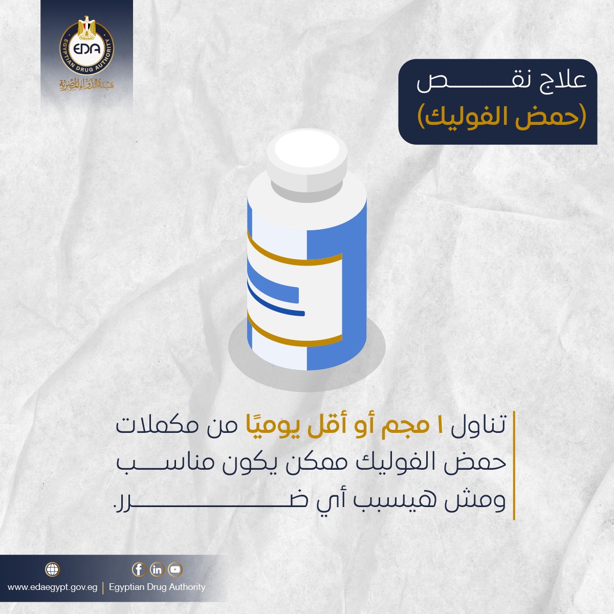 وكشفت هيئة الدواء المصرية علاج نقص حمض الفوليك من خلال تناول 1 مجم أو أقل يوميا من مكملات حمض الفوليك ولا يسبب أي ضرر.