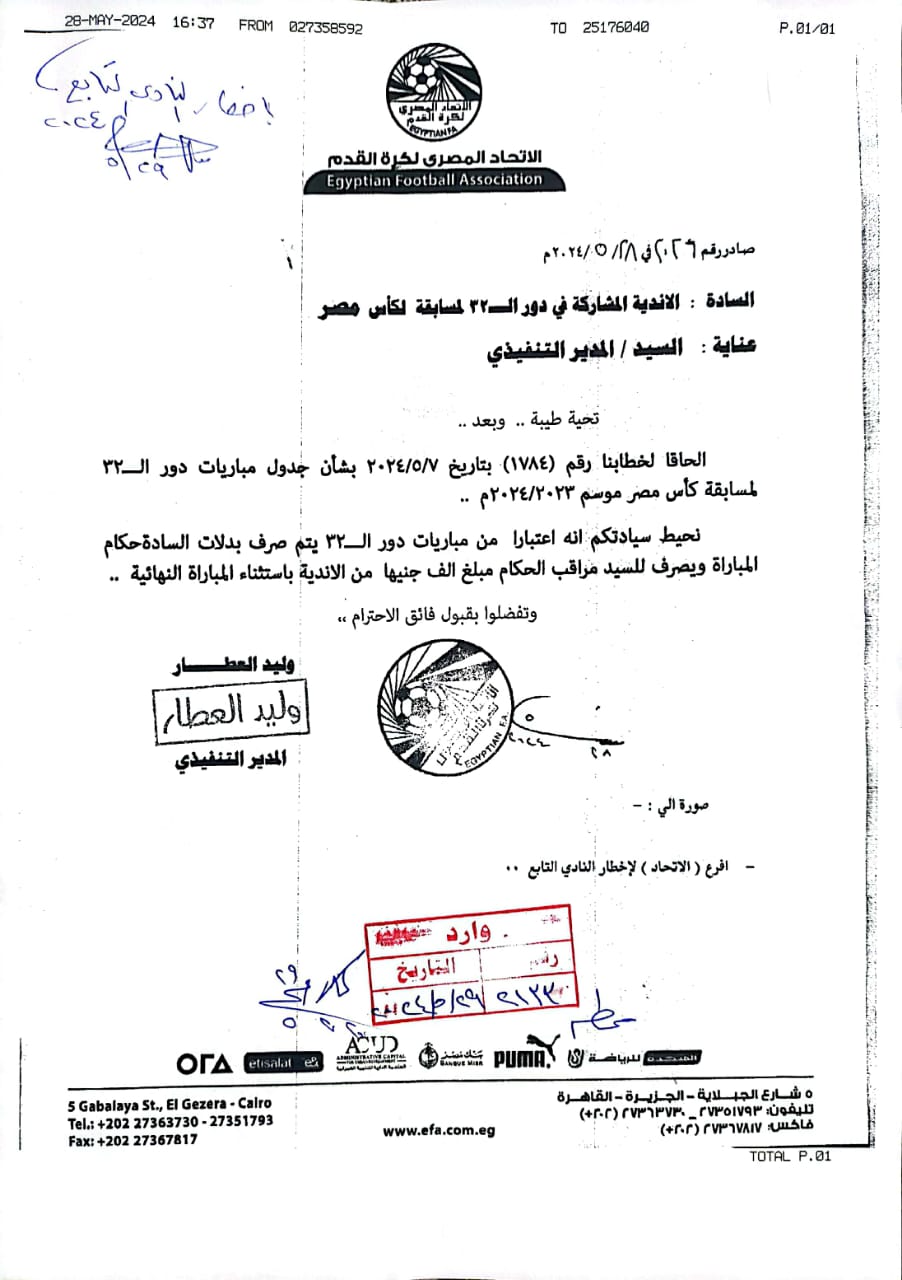 خطاب اتحاد الكرة بشأن كأس مصر