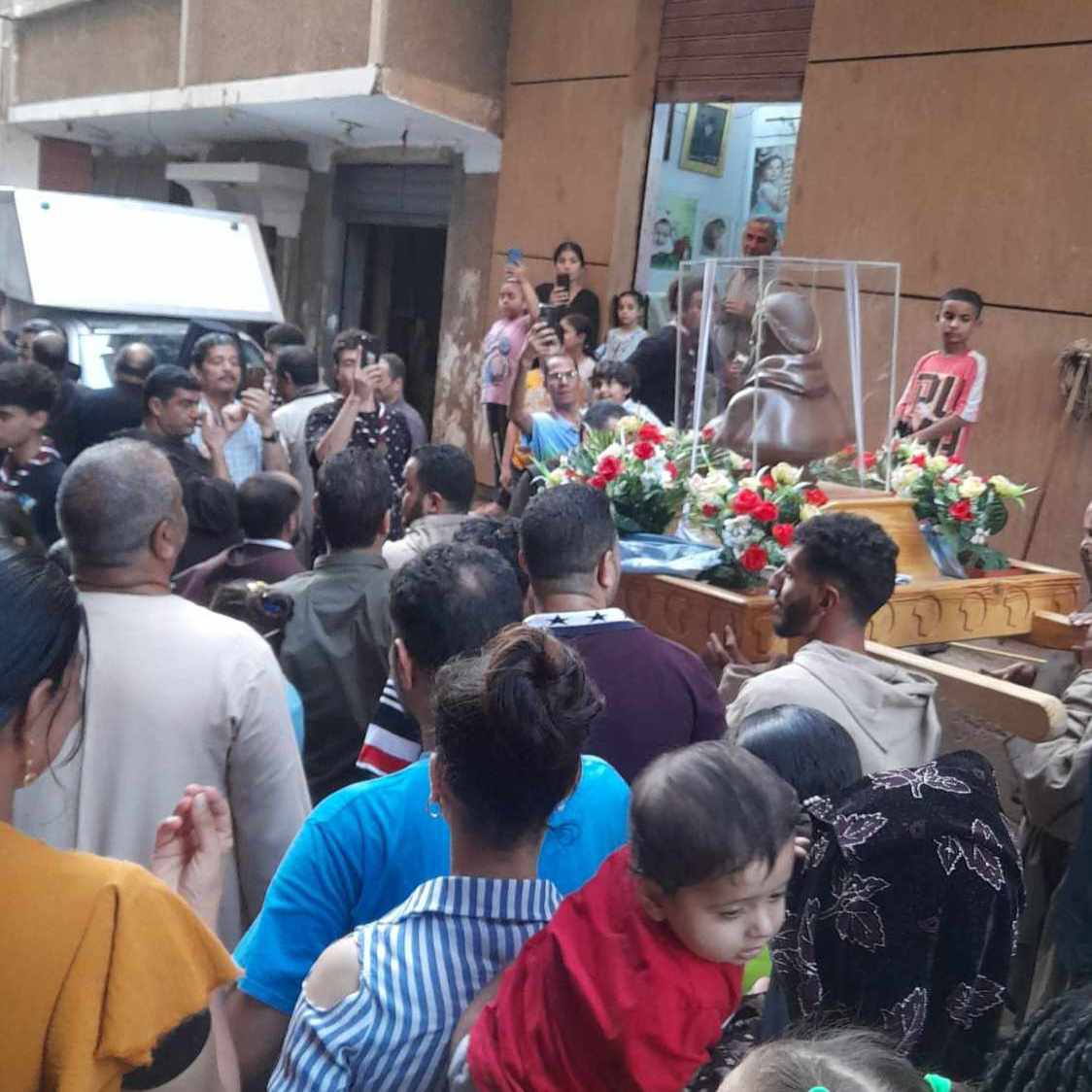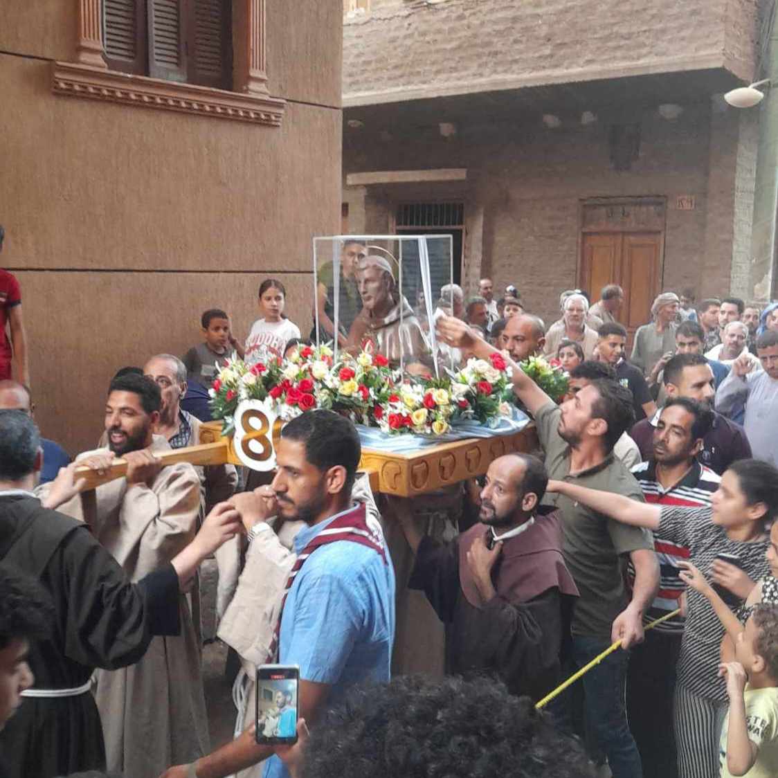 تجمع الأهالي حول رفات القديس فرنسيس وشاركوا في موكب استقبالها حتى الوصول إلى كنيسة السيدة العذراء مريم البياضية في المنيا.