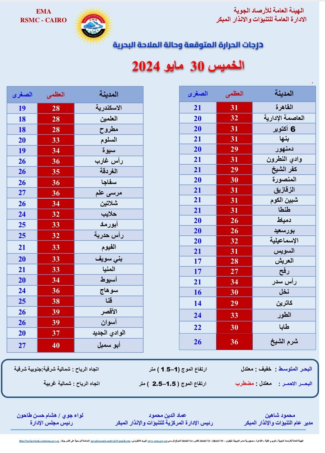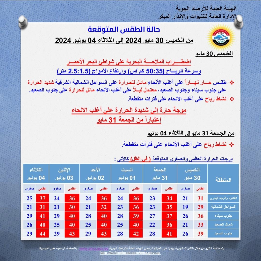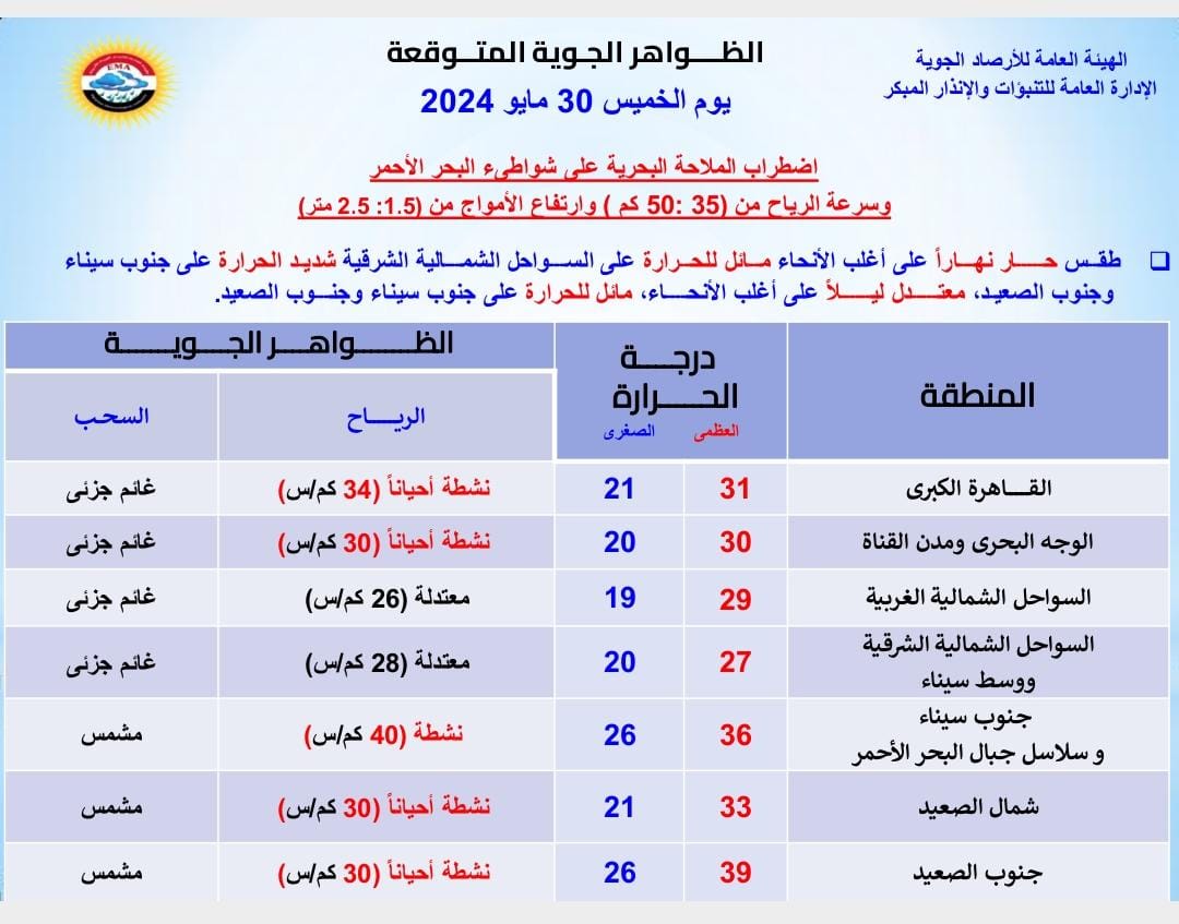 وأشارت إلى أن العظمى بالقاهرة الكبرى تسجل اليوم 31 درجة مئوية كما أن هناك اضطراب في الملاحة البحرية على البحر الأحمر حيث يصل ارتفاع الموج إلى( 1.5-2.5 متر).