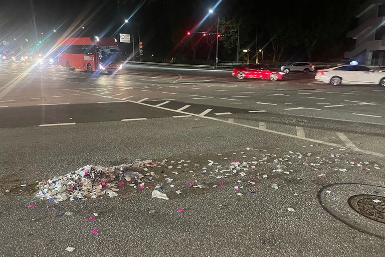 كما أظهرت صور أخرى نفايات متناثرة حول البالونات بعد سقوطها، مع كلمة "فضلات" على كيس في إحدى الصور.