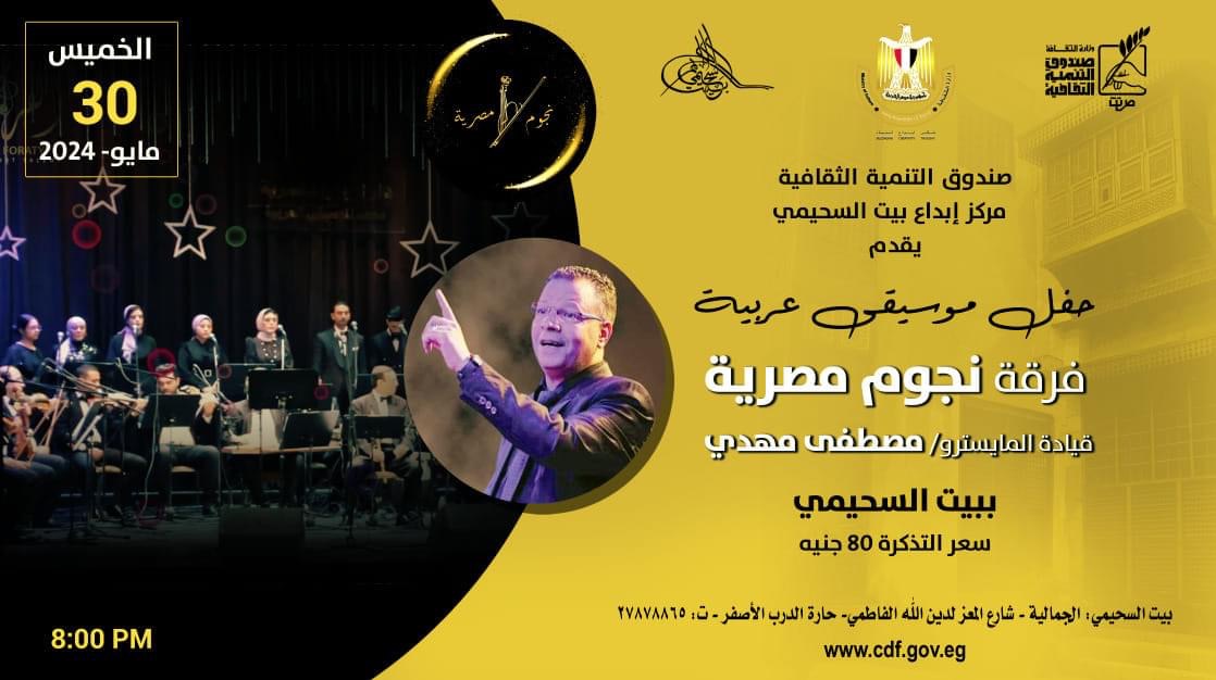 ينظم مركز الإبداع الفني في بيت السحيمي بشارع المعز، والتابع لقطاع صندوق التنمية الثقافية برئاسة الدكتور وليد قانوش، حفلًا موسيقيًا جديدًا لفرقة “نجوم مصرية”، وذلك في الثامنة من مساء اليوم الخميس الموافق 30 مايو الجاري.