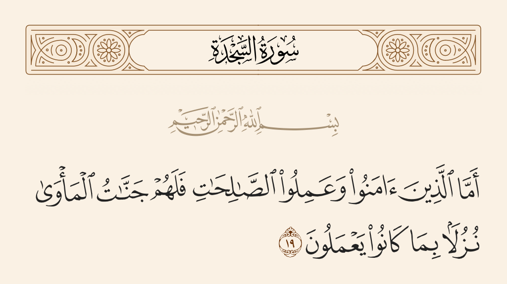 قال تعالى: «أَمَّا الَّذِينَ آمَنُوا وَعَمِلُوا الصَّالِحَاتِ فَلَهُمْ جَنَّاتُ الْمَأْوَى نُزُلًا بِمَا كَانُوا يَعْمَلُونَ».
