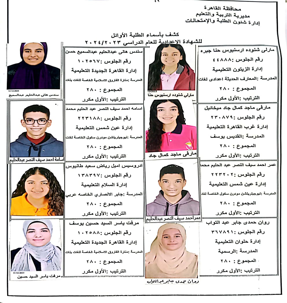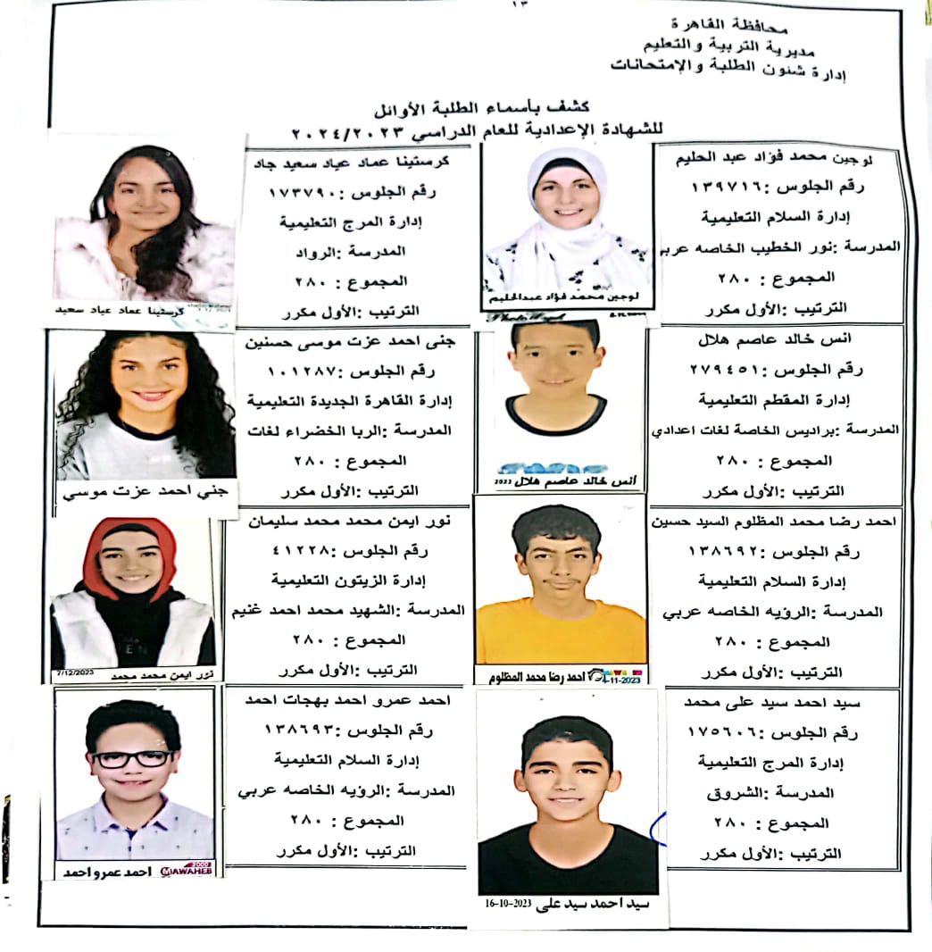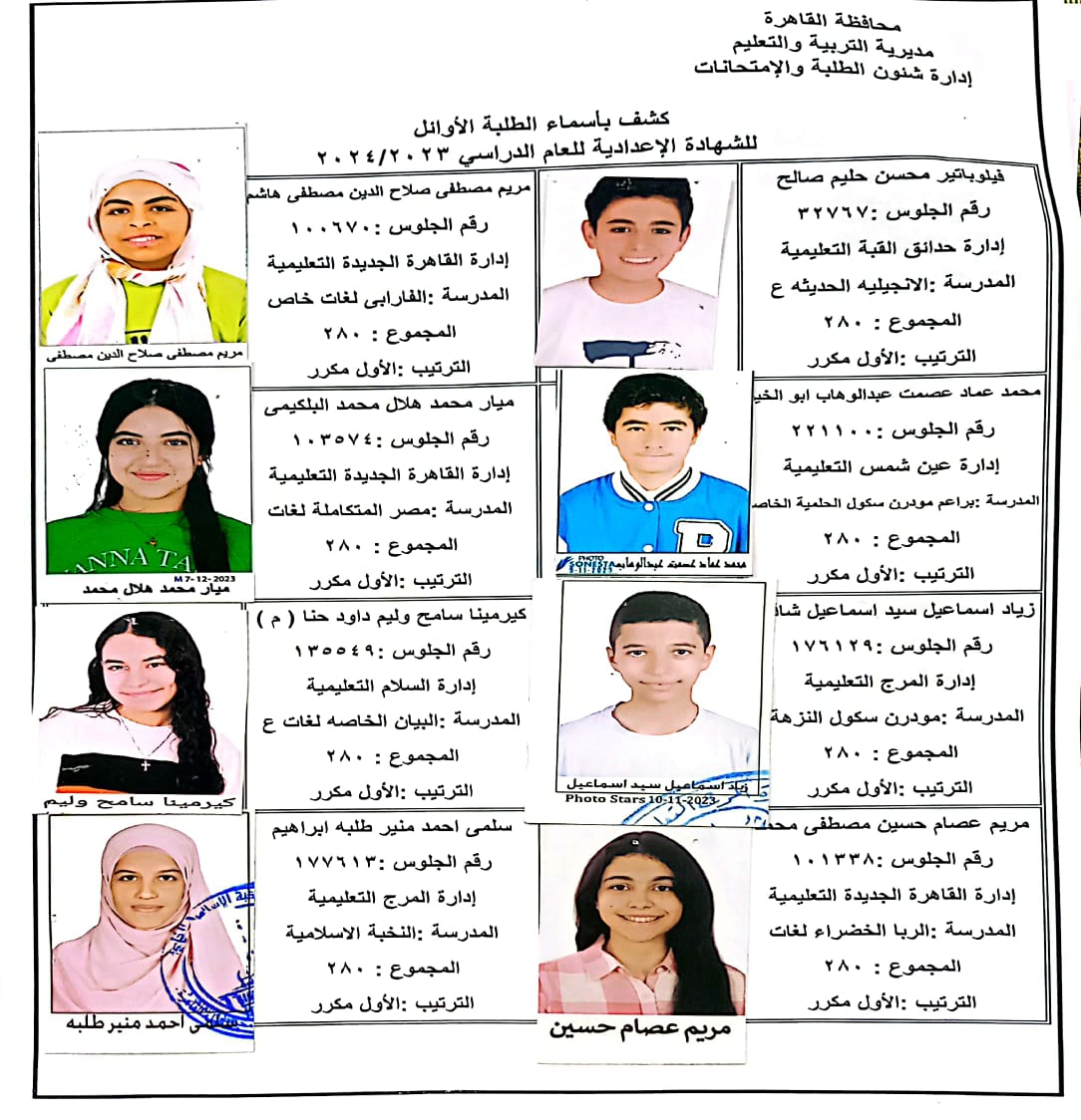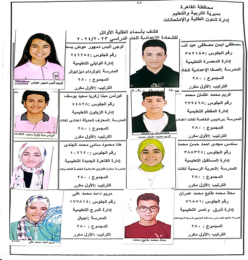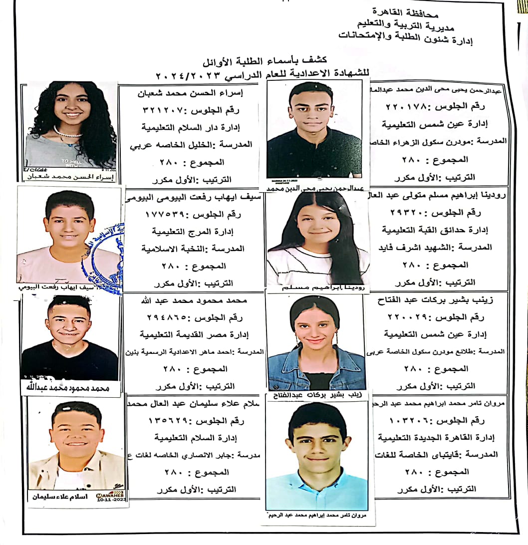 ننشر أسماء أوائل الشهادة الإعدادية 2024 بالقاهرة