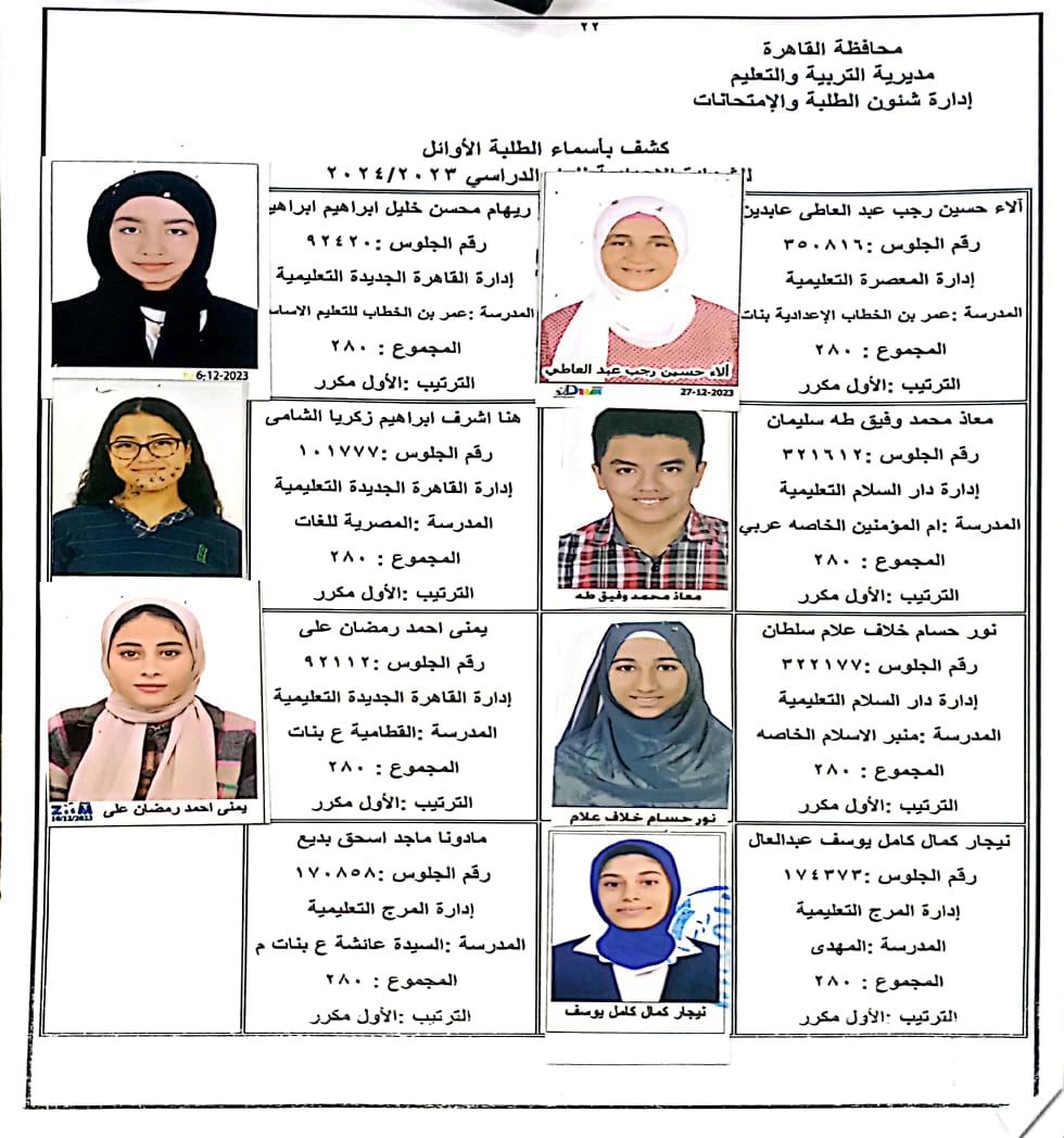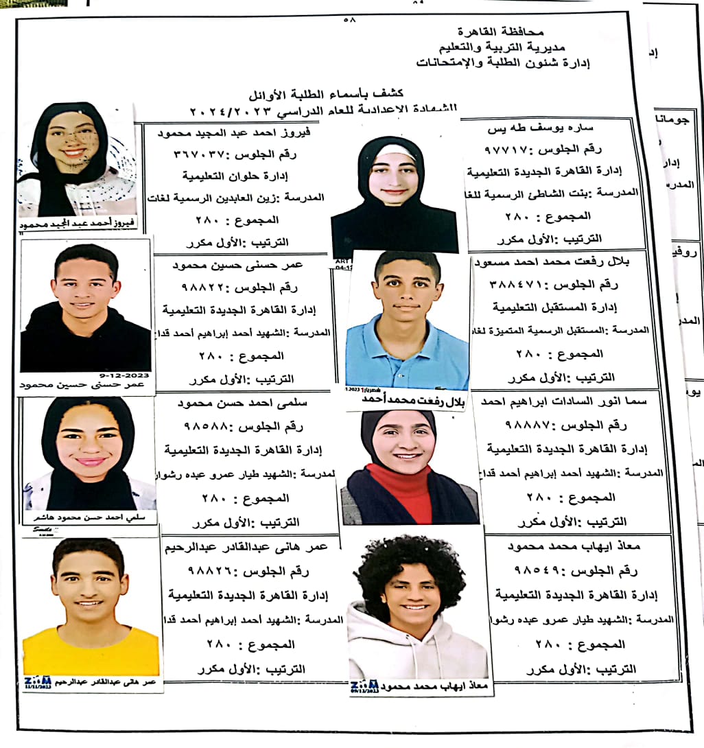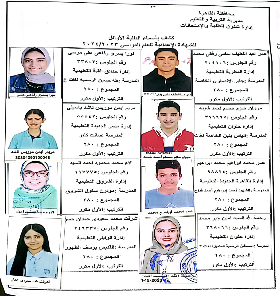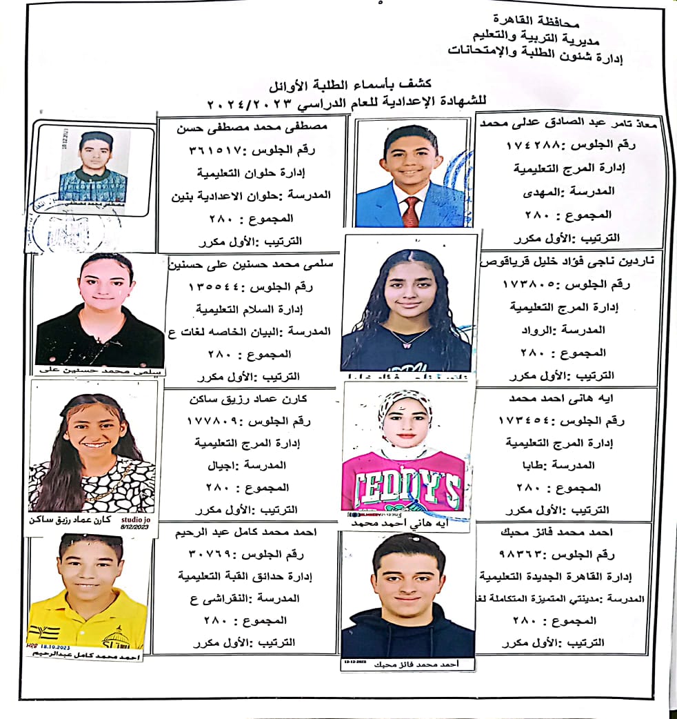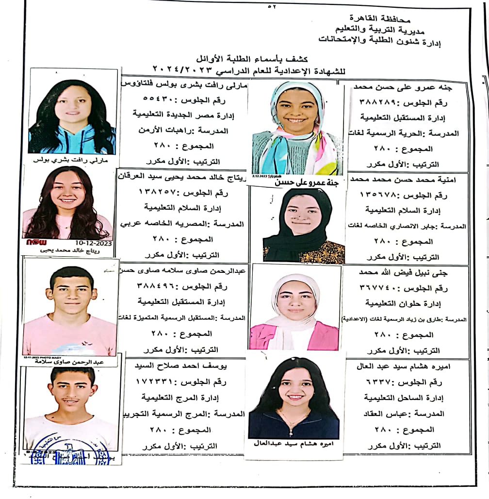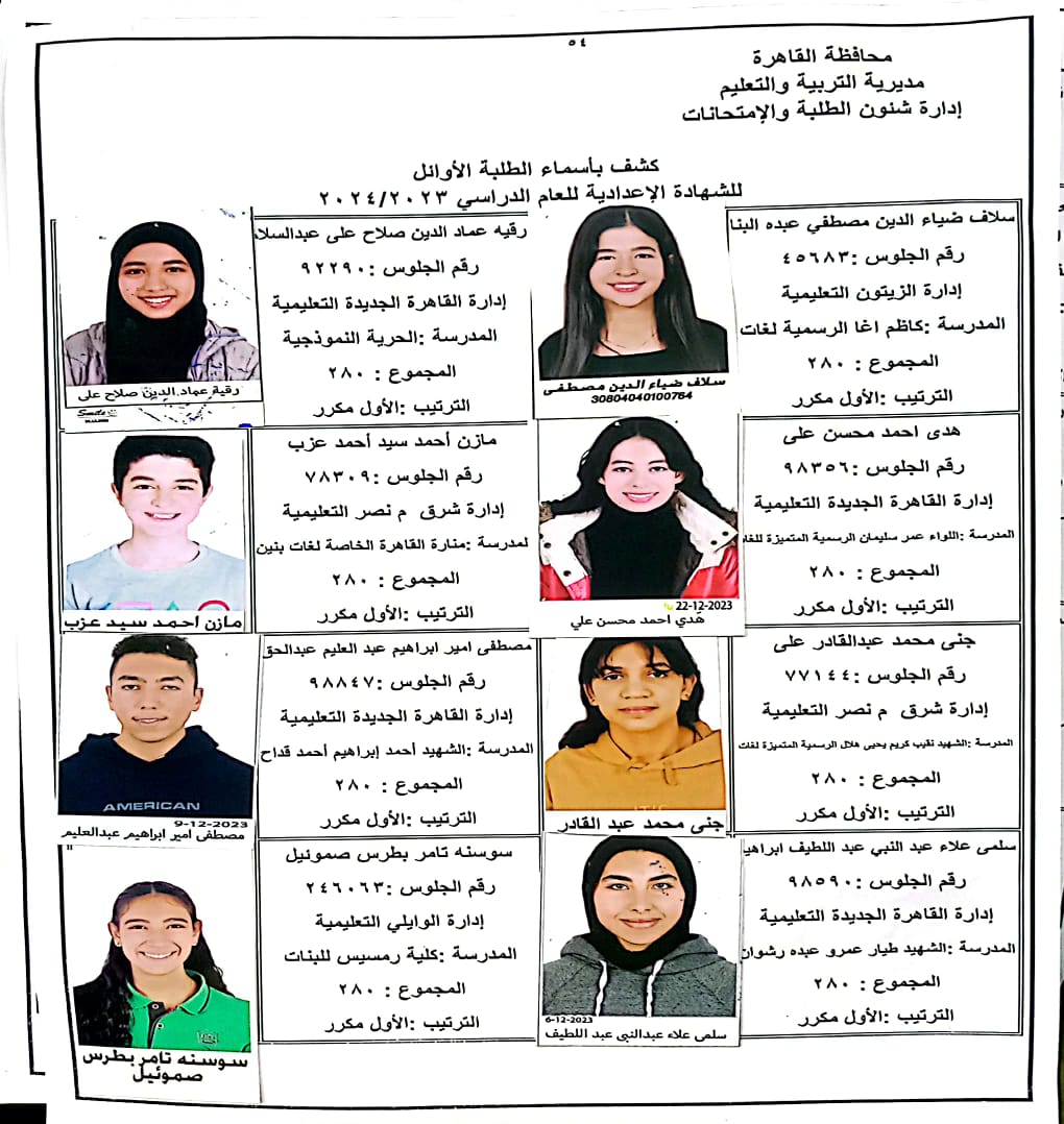 ننشر أسماء أوائل الشهادة الإعدادية 2024 بالقاهرة