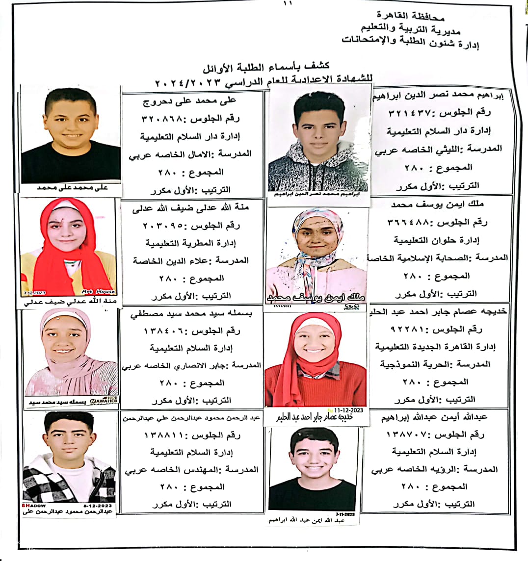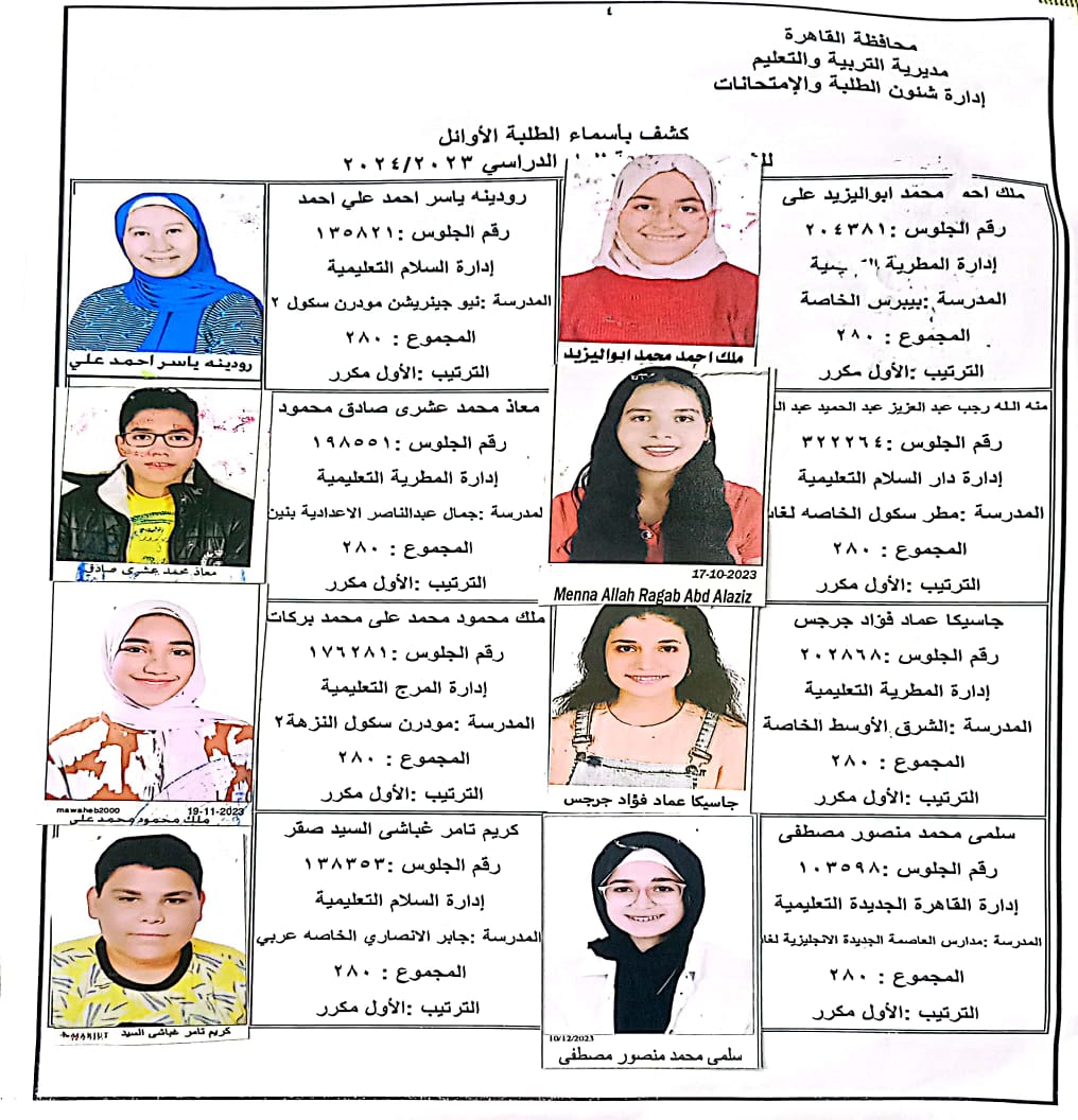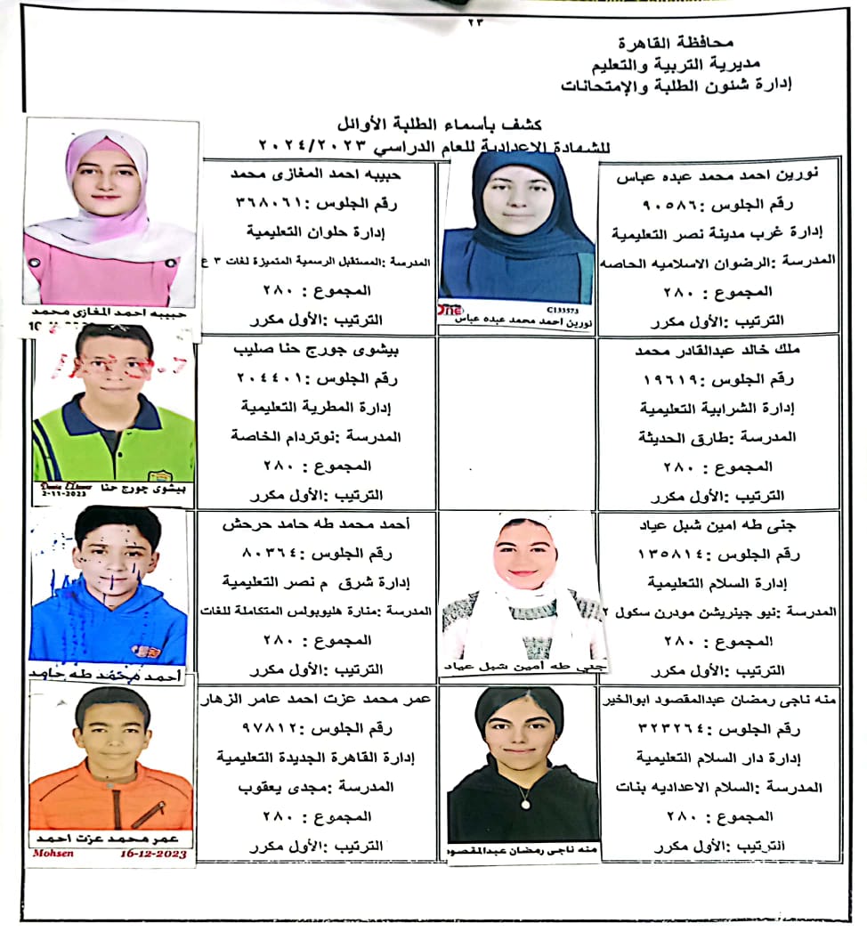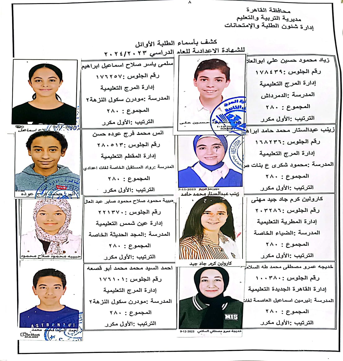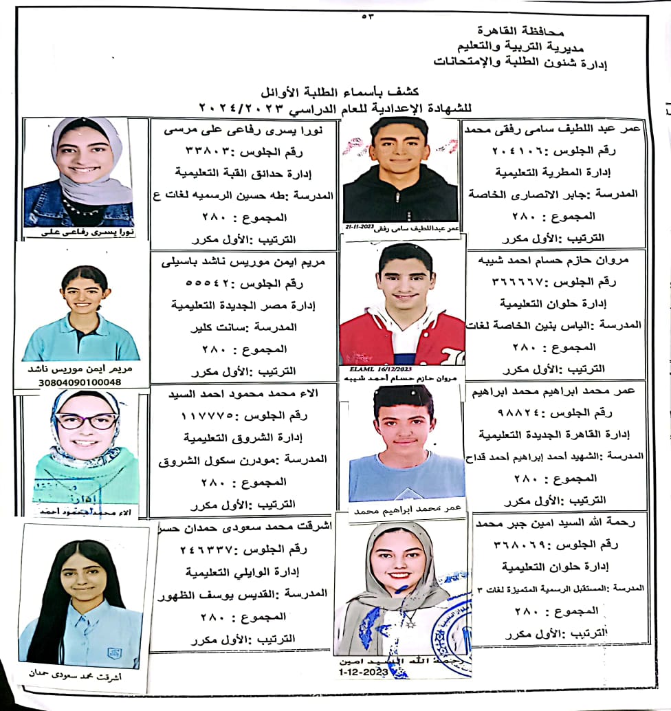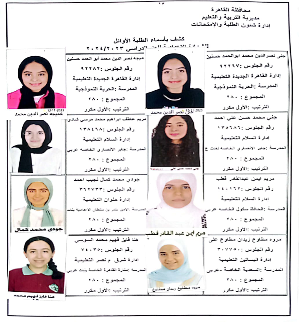 ننشر أسماء أوائل الشهادة الإعدادية 2024 بالقاهرة