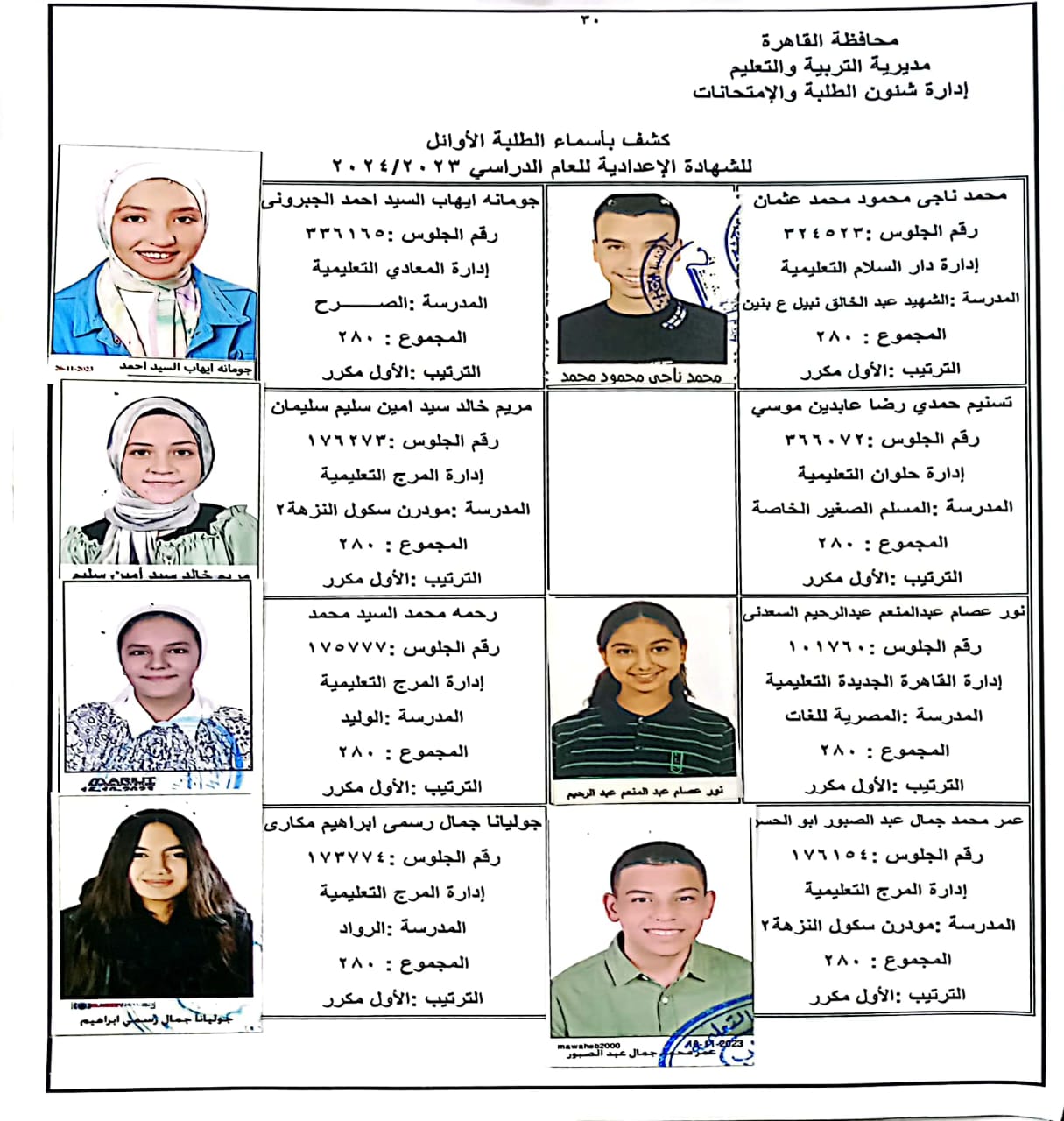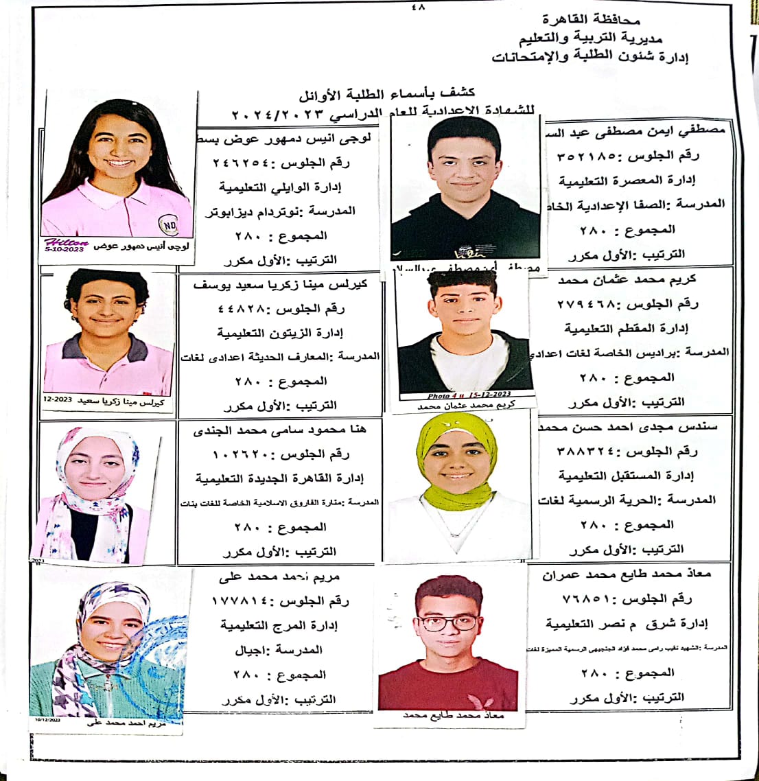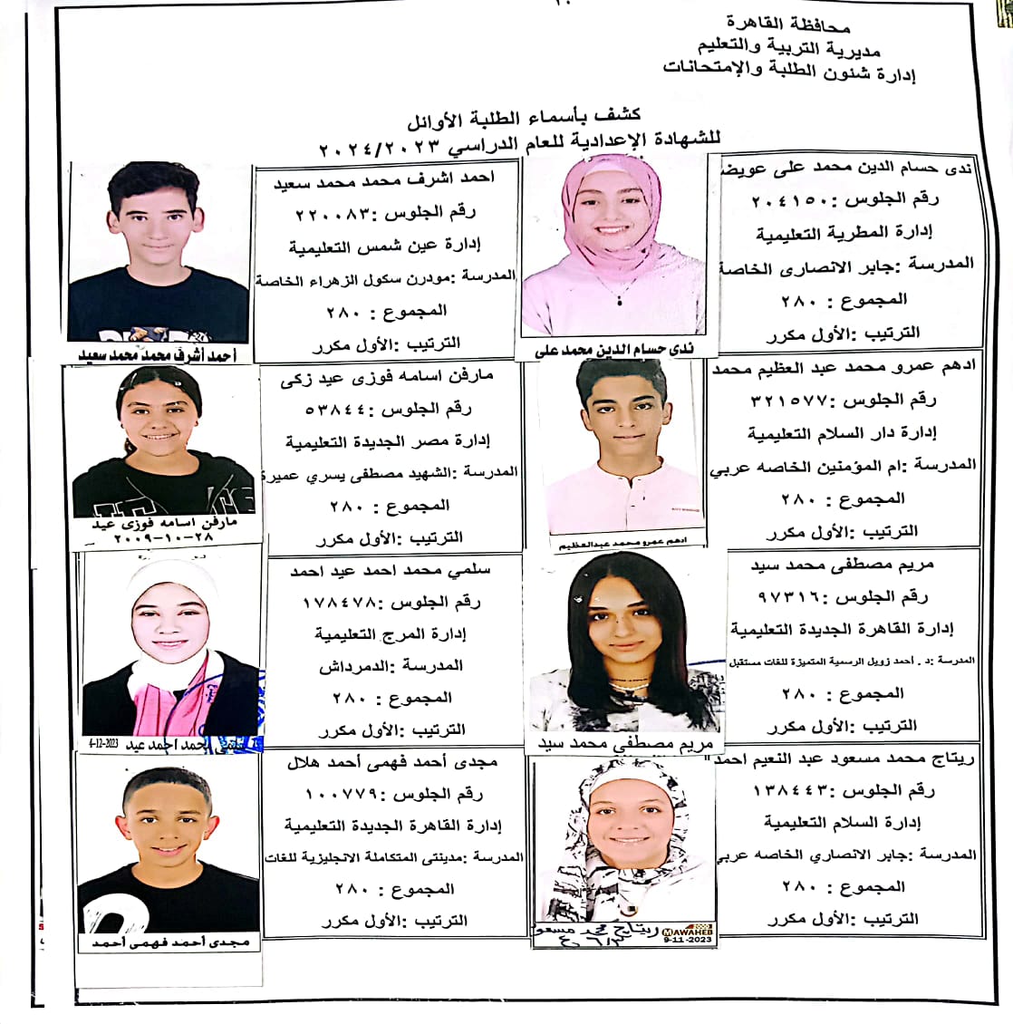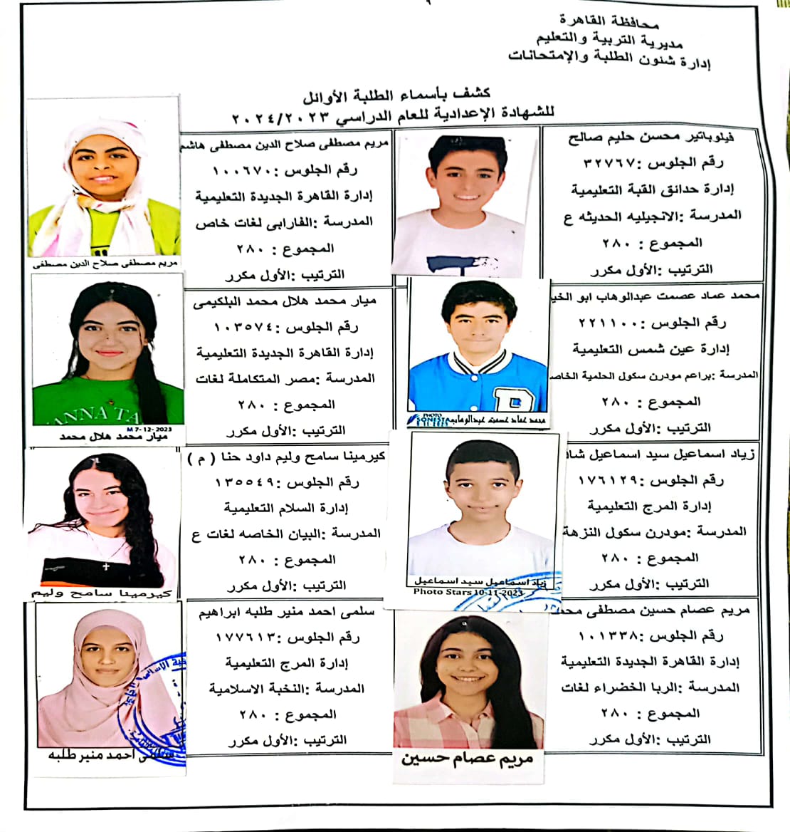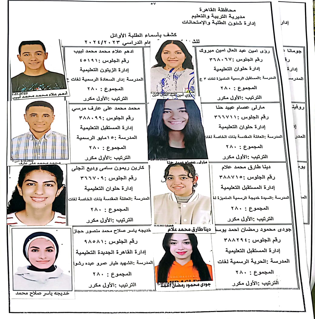 ننشر أسماء أوائل الشهادة الإعدادية 2024 بالقاهرة