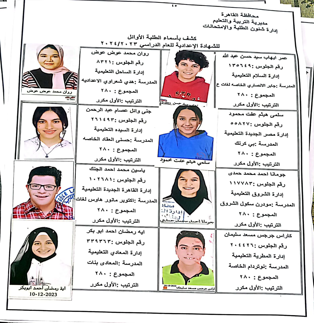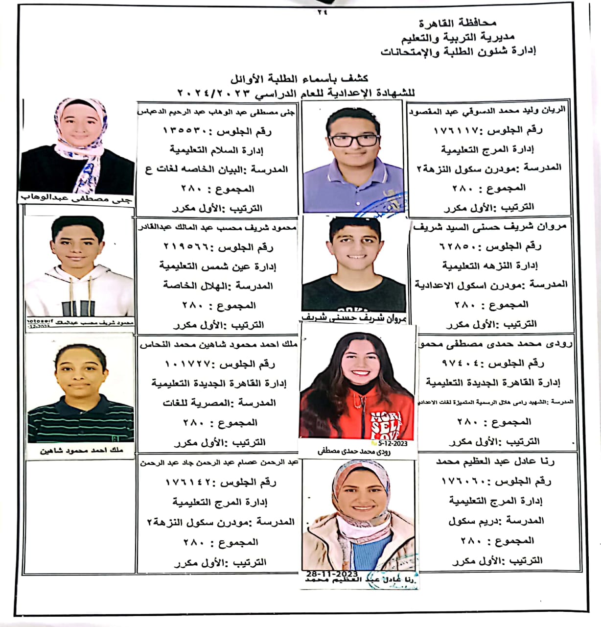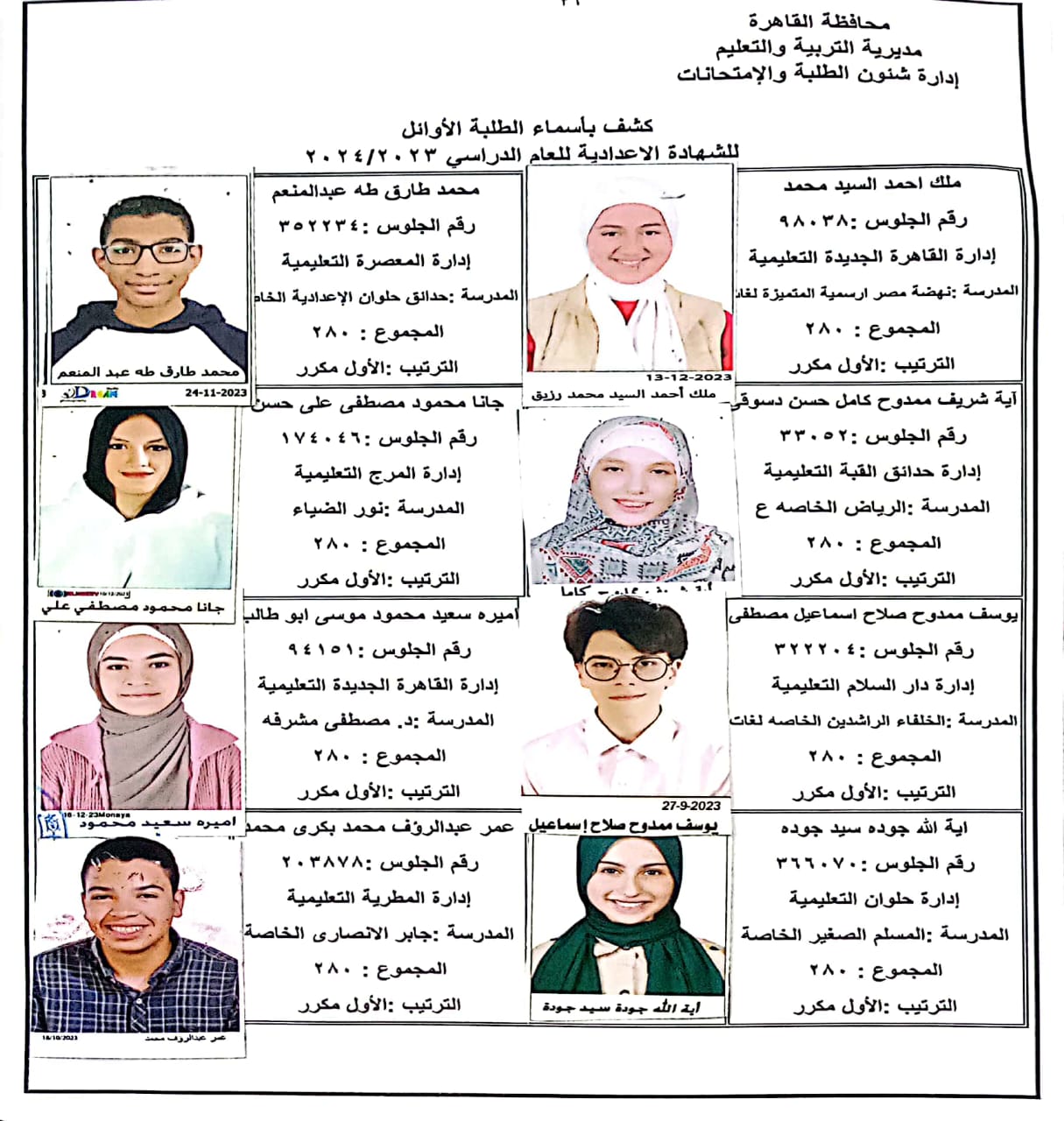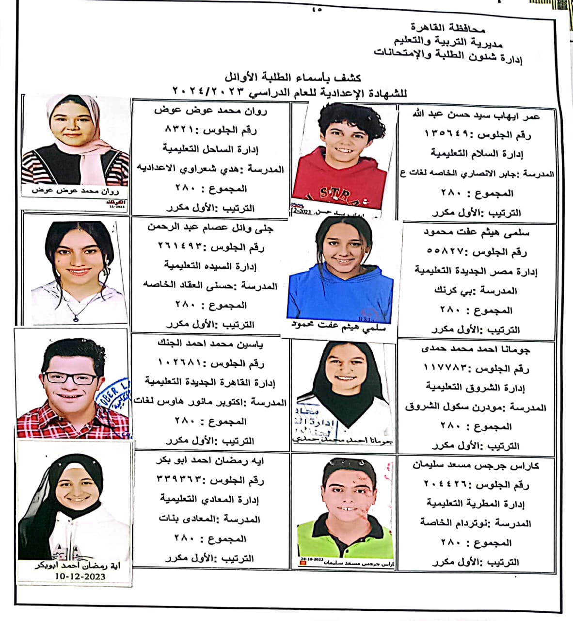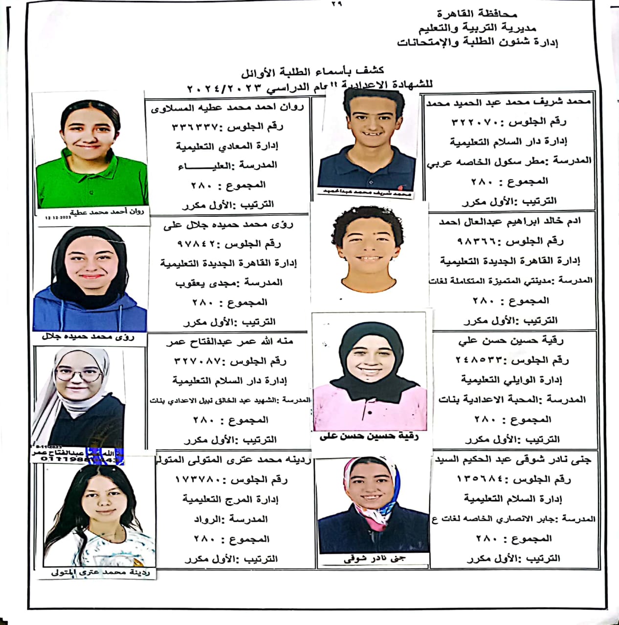 ننشر أسماء أوائل الشهادة الإعدادية 2024 بالقاهرة