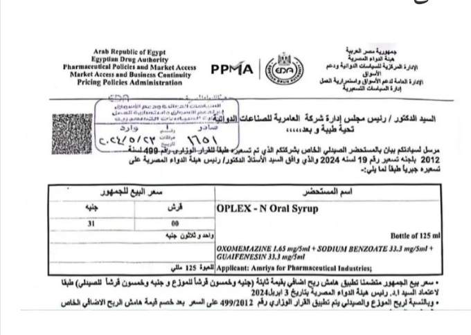 أصدرت إدارة السياسات التسعيرية بهيئة الدواء المصرية قرارا بالموافقة على زيادة سعر دواء أوبلكس شراب إلى 31 جنيها بعد ما كان سعره 19 جنيها.