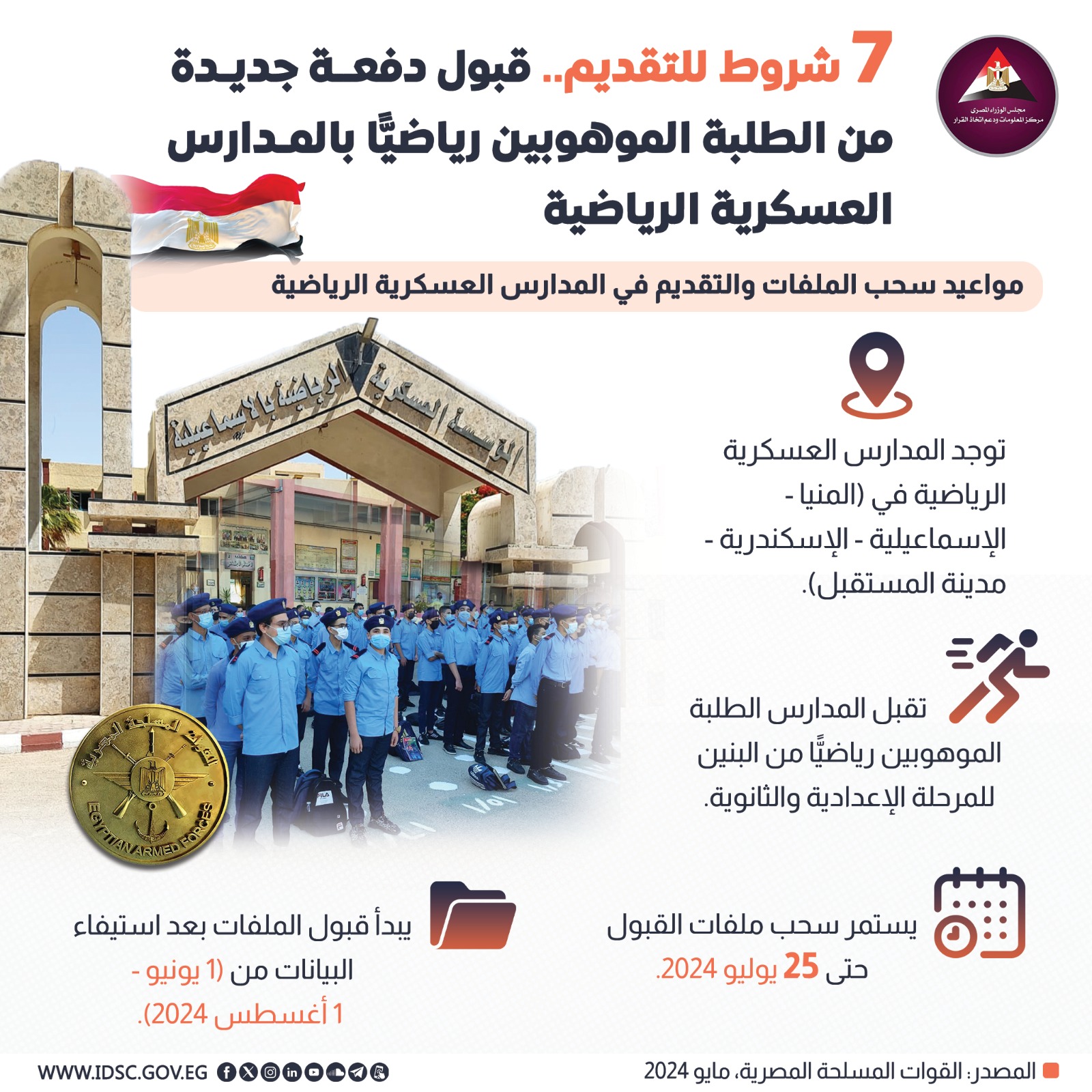 كشف مركز المعلومات ودعم اتخاذ القرار بمجلس الوزراء عن تفاصيل قبول دفعة جديدة من الطلبة الموهوبين رياضيا بالمدارس العسكرية.