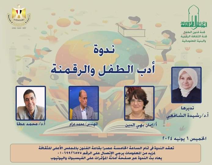 تُقيم الدكتورة رشيدة الشافعي مقررة لجنة فنون الطفل ود. محمد خليف مقرر لجنة الثقافة الرقمية والبنية المعلوماتية بـ المجلس الأعلى للثقافة ندوة "أدب الطفل والرقمنة"، وذلك في تمام الخامسة مساء الخميس الموافق ٦ يونيو ٢٠٢٤ بقاعة الفنون بالمجلس الأعلى للثقافة..
