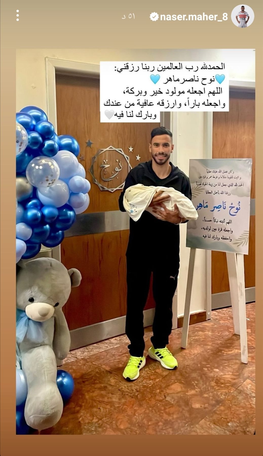 رزق ناصر ماهر لاعب الفريق الأول لكرة القدم بنادي الزمالك، بمولود جديد أطلق عليه اسم نوح.