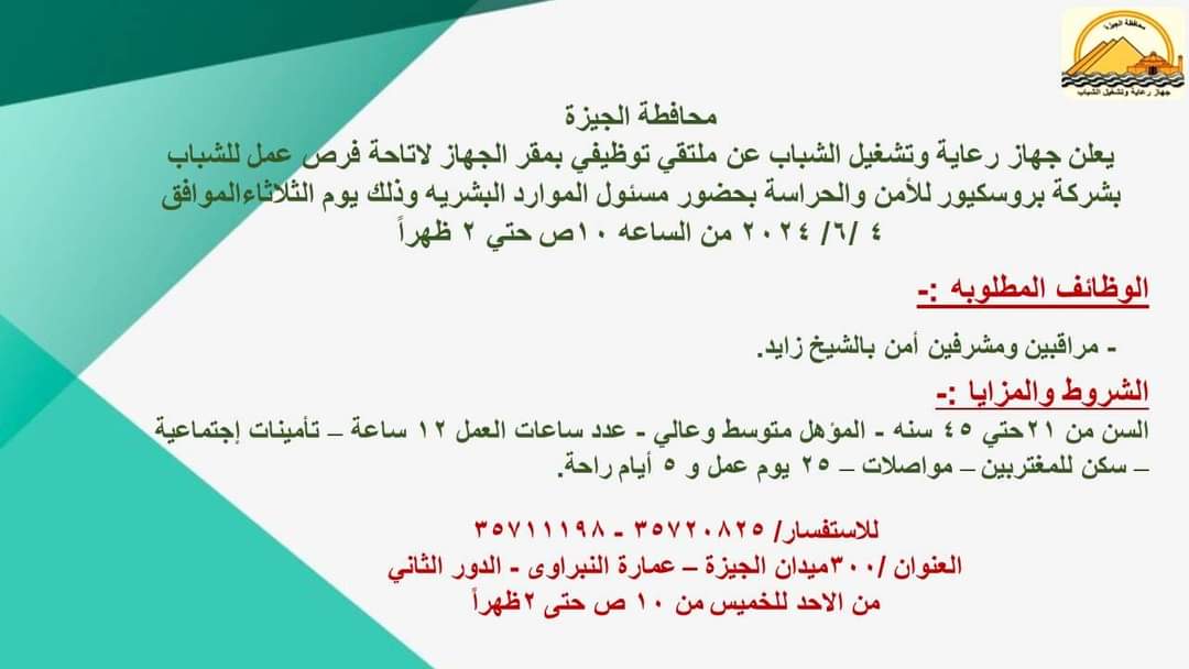 وأشار الجهاز إلى أن الوظائف المطلوبة تتمثل في مراقبين ومشرفين أمن بالشيخ زايد وأضاف الجهاز أن الشركة تشترط على راغبي العمل أن لا يتعدى عمره ٤٥ سنة وأن يكون حاصل على مؤهل متوسط وعالي المزايا التي توفرها الشركة للعاملين بها توافر تأمينات اجتماعية وسكن للمغتربين وتوافر مواصلات و٢٥ يوم عمل مقابلها ٥ أيام راحة.