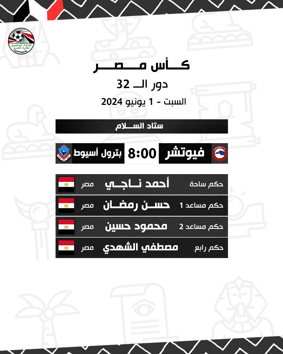 مباراة فيوتشر ضد بترول أسيوط يديرها أحمد ناجي “حكم ساحة” ويعاونه كل من حسن رمضان ومحمود حسين “حكمين مساعدين” ومصطفى الشهدي “حكم رابع”.