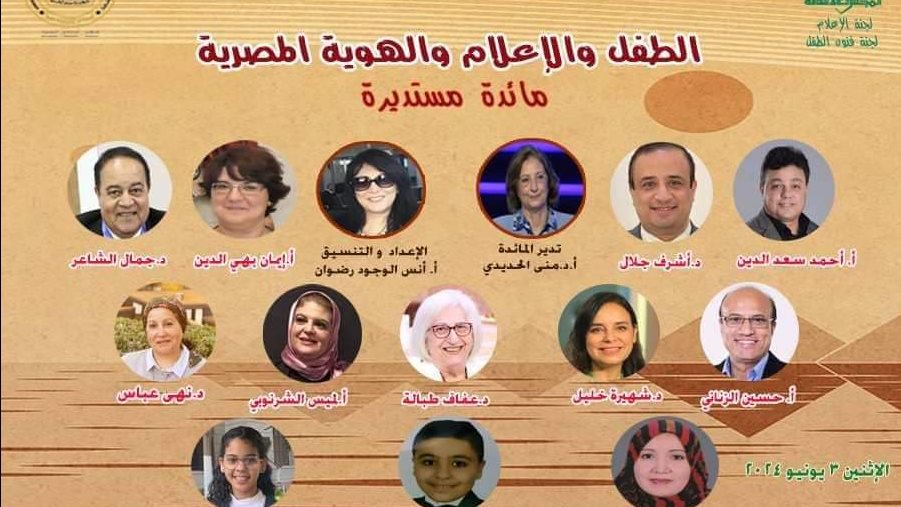 يطلق الدكتور جمال الشاعر - مقرر لجنة الإعلام و د.رشيدة الشافعي - مقررة لجنة فنون الطفل ب المجلس الأعلى للثقافة مائدة مستديرة بعنوان"الطفل والإعلام والهوية المصرية".