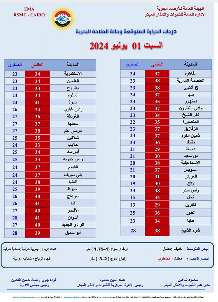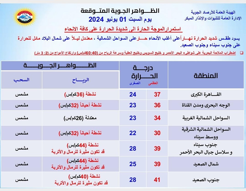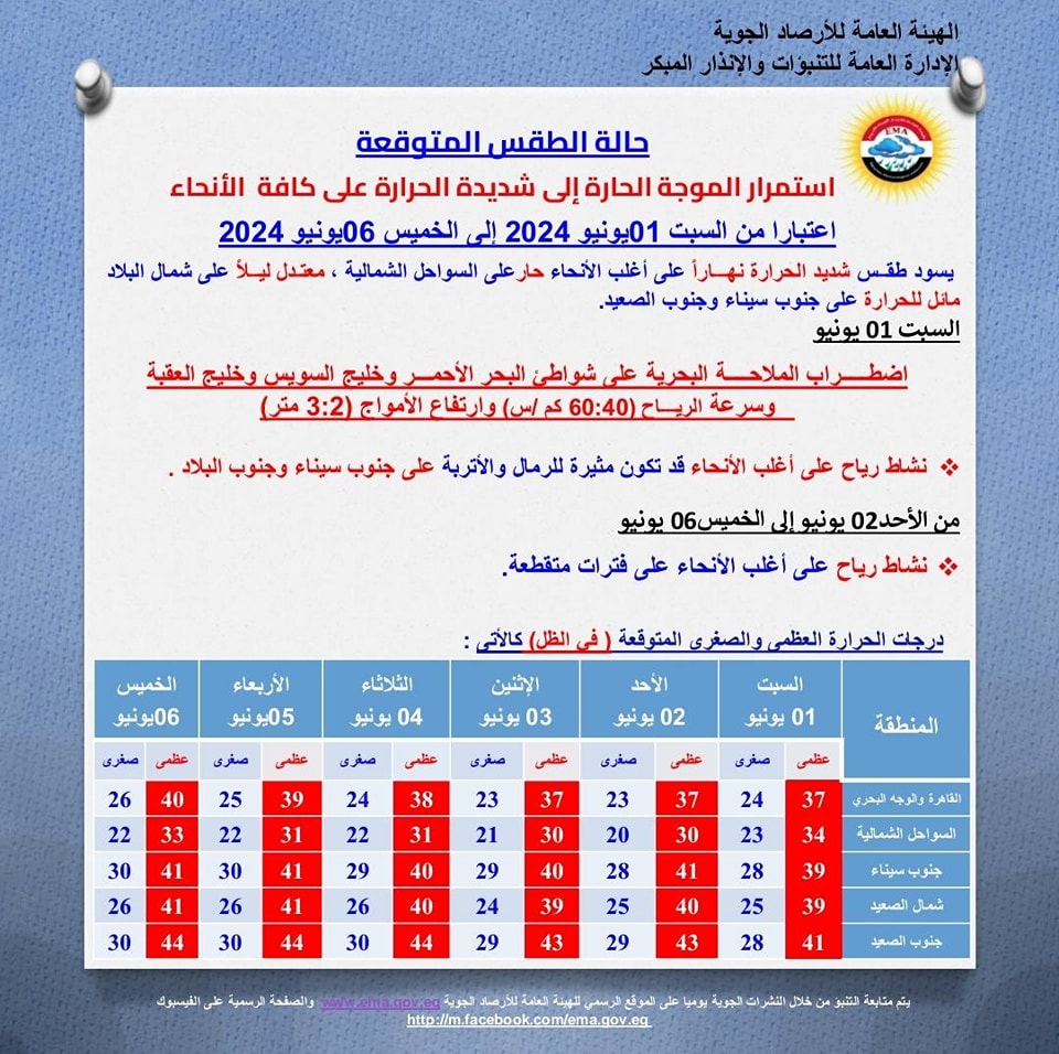 وقالت في بيان، ارتفاع ملحوظ في درجات الحرارة لتسود أجواء شديدة الحرارة اعتبارًا من اليوم السبت 01 يونيو حتى نهاية الأسبوع حيث تتراوح درجات الحرارة على القاهرة من 37:40 درجة كما تنشط الرياح على شمال وجنوب الصعيد وجنوب سيناء تكون مثيرة للرمال والأتربة.