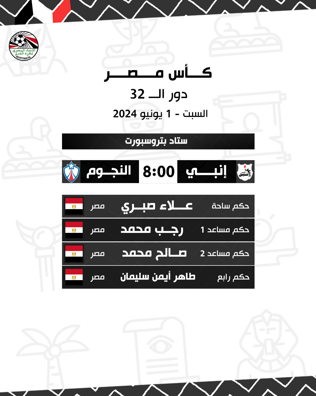 مباراة إنبي ضد النجوم يديرها علاء صبري “حكم ساحة” ورجب محمد وصالح محمد “حكمين مساعدين” وطاهر أيمن سليمان “حكم رابع”.