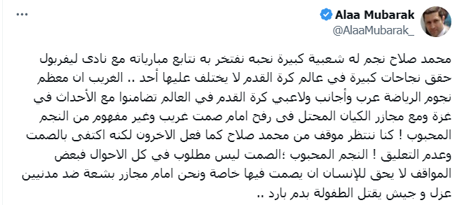 وأضاف علاء مبارك في رسالته لمحمد صلاح "كنا ننتظر موقف من محمد صلاح كما فعل الآخرون لكنه اكتفى بالصمت وعدم التعليق! النجم المحبوب؛ الصمت ليس مطلوبا في كل الأحوال فبعض المواقف لا يحق للإنسان أن يصمت فيها خاصة ونحن أمام مجازر بشعة ضد مدنيين عزل وجيش يقتل الطفولة بدم بارد.."
