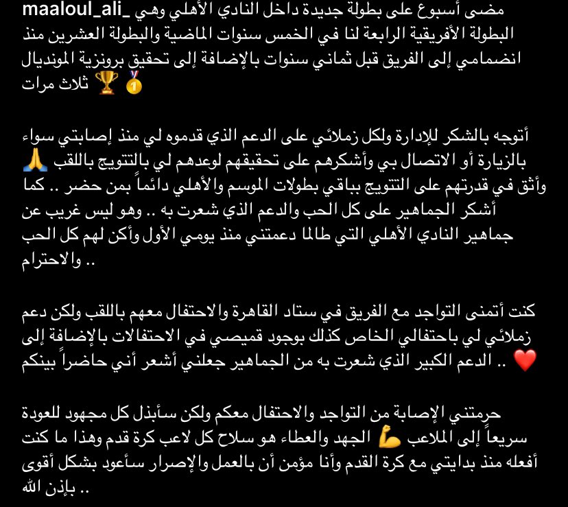 وكتب معلول عبر حسابه: “مضى أسبوع على تحقيق بطولة إفريقيا، أتوجه بالشكر لـ النادي الأهلي وزملائي لدعمي بعد الإصابة، وأشكر جماهير الفريق على دعمي منذ اليوم الأول وأكن لهم كل الاحترام”.