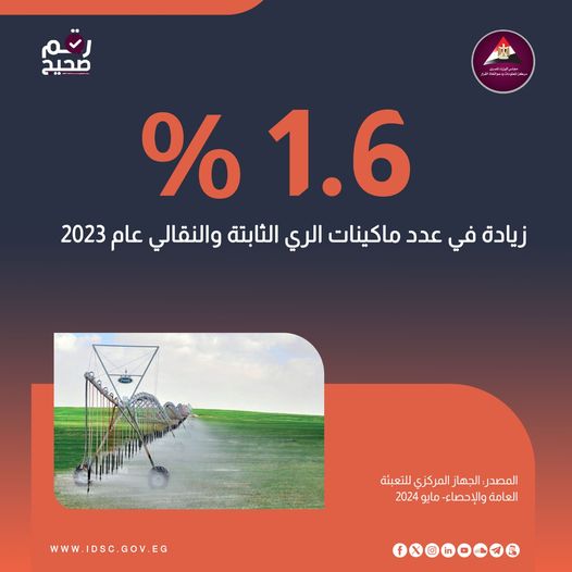 كشف مركز المعلومات ودعم اتخاذ القرار بمجلس الوزراء عن زيادة في عدد ماكينات الري الثابتة والنقالي خلال 2023.
