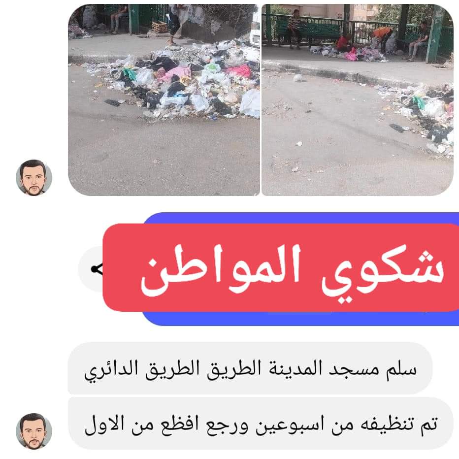 تلقت الصفحة الرسمية لمحافظة الجيزة شكوى من أحد المواطنين بوجود مخلفات وقمامة بسلم الطريق الدائري بمنطقه مسجد المدينة بحي الهرم.