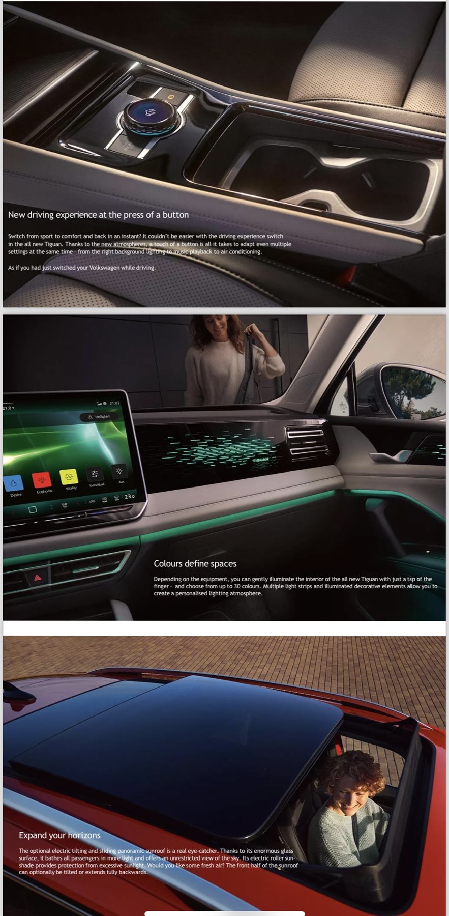 شَهدت المقصورة الداخلية لفولكس فاجن تيجوان الجديدة كليًّا تغيُّرًا جِذريًّا مقارنة بمقصورة الطراز السابق؛ حيث باتت تستفيد حاليًّا من مظهر أكثر بساطة وتصميمًا أنيقًا يَغلب عليه الطابع التقني المميَّز.