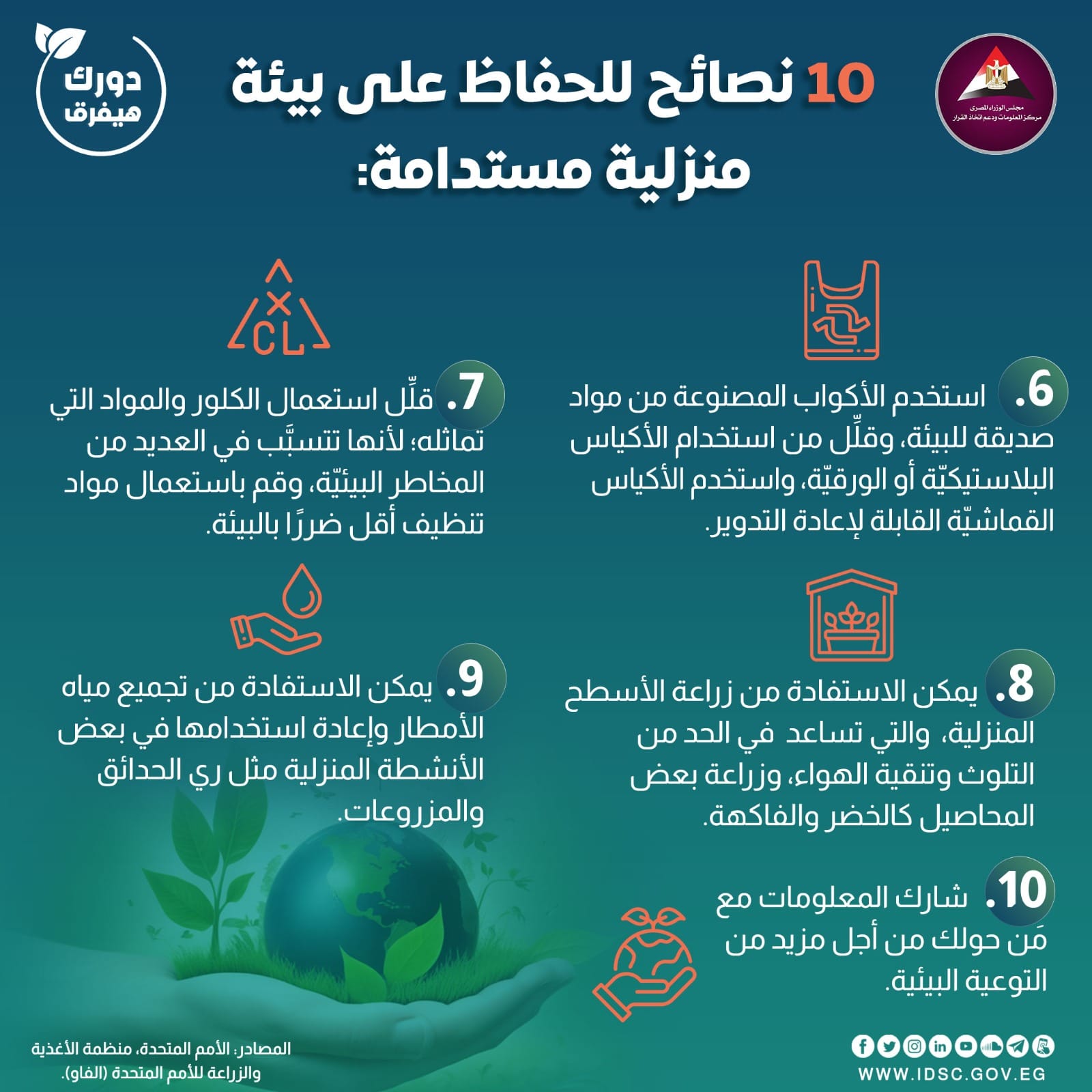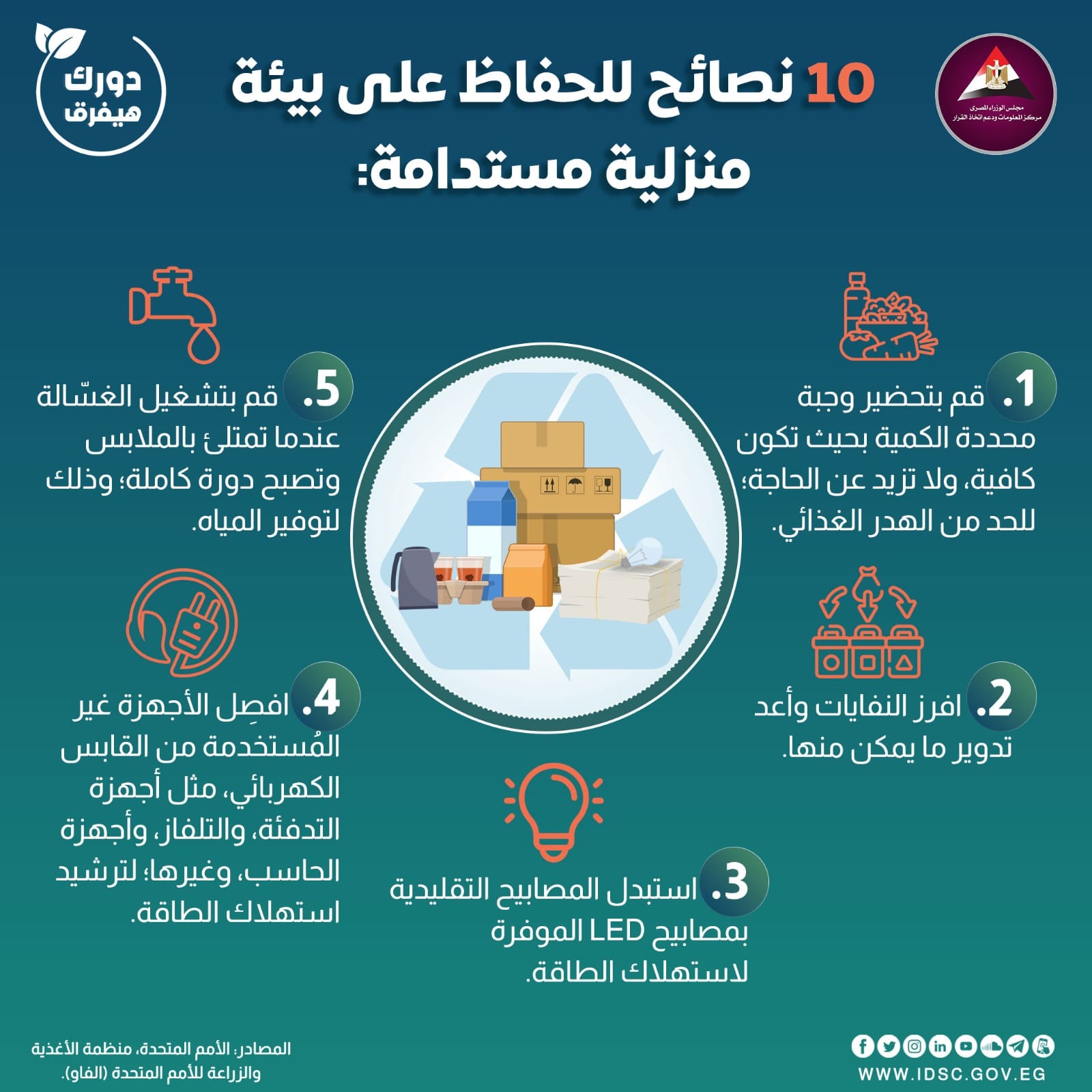سلط مركز المعلومات ودعم اتخاذ القرار بـ مجلس الوزراء الضوء على أبرز 10 نصائح للحفاظ على بيئة منزلية مستدامة.