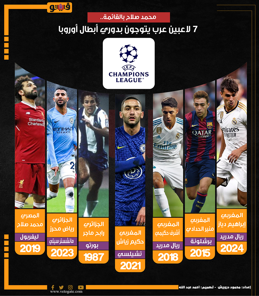 محمد صلاح بالقائمة.. 7 لاعبين عرب يتوجون بدوري أبطال أوروبا (انفوجراف) الأحد 02/يونيو/2024 - 02:22 م 6/2/2024 2:22:08 PM دوري أبطال أوروبا محمود درويش شارك طباعة 18 حجم الخط شارك طباعة دوري ابطال اوروبا إبراهيم دياز الجزائري رابح ماجر المغربي منير الحدادي المغربي حكيم زياش المغربي أشرف حكيمي رياض محرز رابح ماجر محمد صلاح