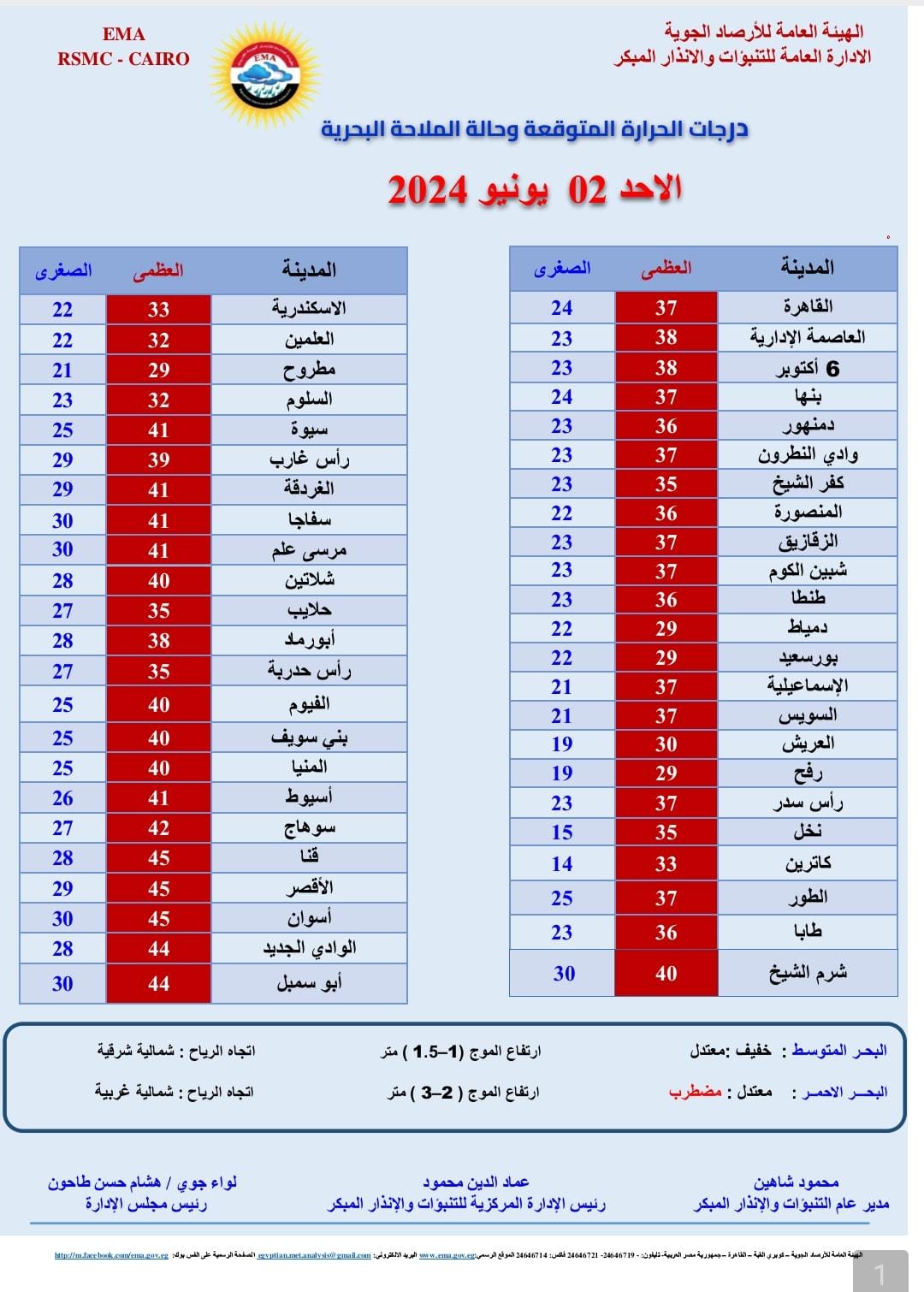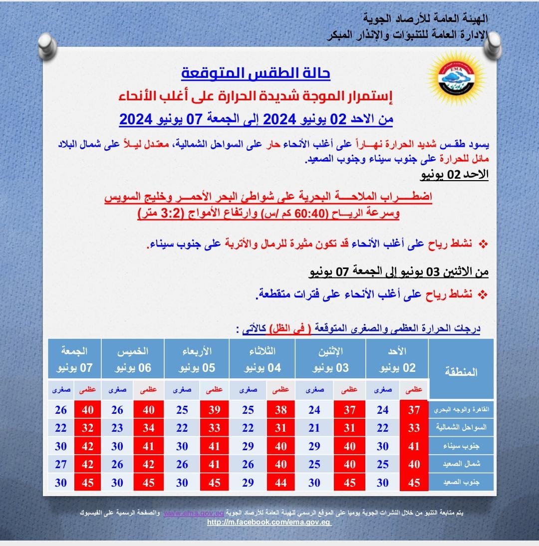 وأضافت أن درجات الحرارة اليوم تسجل 37 بالقاهرة الكبرى وتصل إلى 45 جنوب الصعيد، لترتفع تدريجيا لتسجل 40 درجة يوم الجمعة المقبل بالقاهرة.