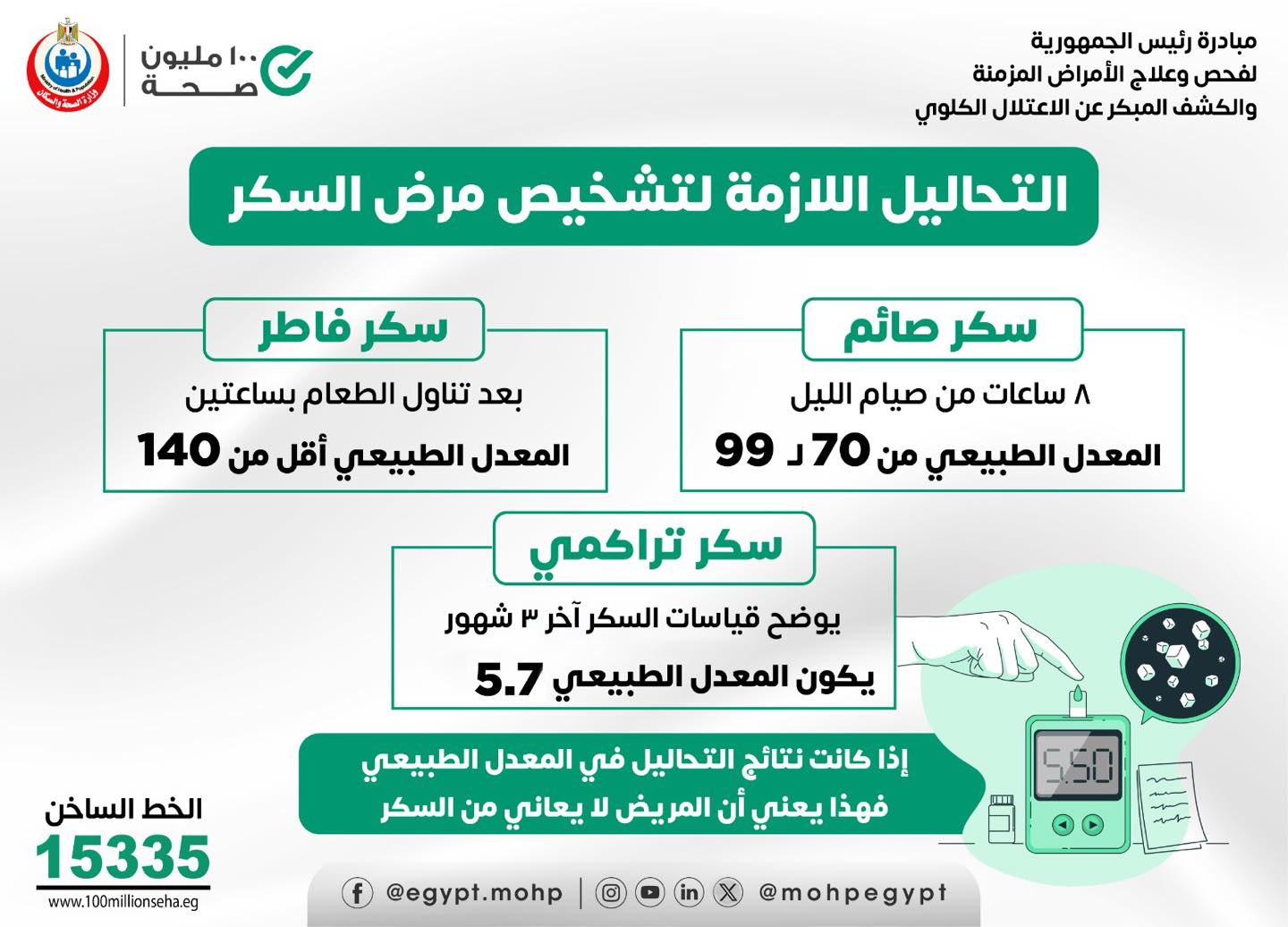 وأشارت وزارة الصحة أن تحليل السكر التراكمي يوضح قياسات مرض السكر آخر 3 شهور ويكون المعدل الطبيعي 5.7.
