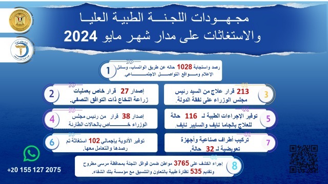 وخلال التقرير، لفت الدكتور حسام المصري، إلى أن جهود اللجنة الطبية العليا خلال شهر مايو المنقضي، شملت الاستجابة لعدد 1028 حالة تم رصدها عن طريق تطبيق "واتس آب" ووسائل الإعلام ومواقع التواصل الاجتماعي المتنوعة.