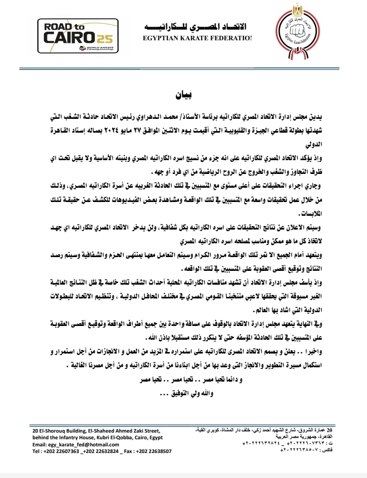وواصل البيان، ويتعهد أمام الجميع الا تمر تلك الواقعة مرور الكرام وسيتم التعامل معها بمنتهى الحزم والشفافية وسيتم رصد النتائج وتوقيع أقصى العقوبة على المتسببين في تلك الواقعة، ويأسف مجلس إدارة الاتحاد أن تشهد منافسات الكاراتيه المحلية أحداث الشغب تلك خاصة في ظل النتائج العالمية الغير مسبوقة التي يحققها لاعبي منتخبنا القومي المصري في مختلف المحافل الدولية، وتنظيم الاتحاد للبطولات الدولية التي أشاد بها العالم.