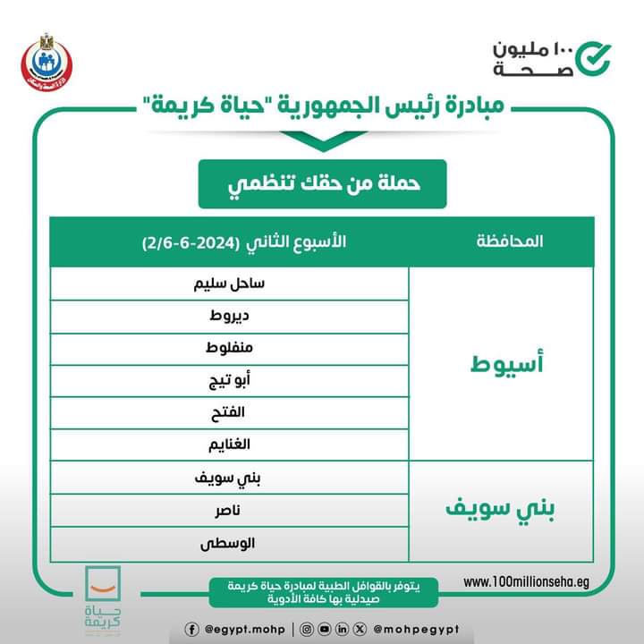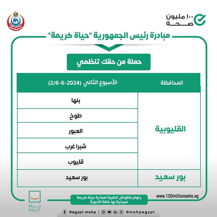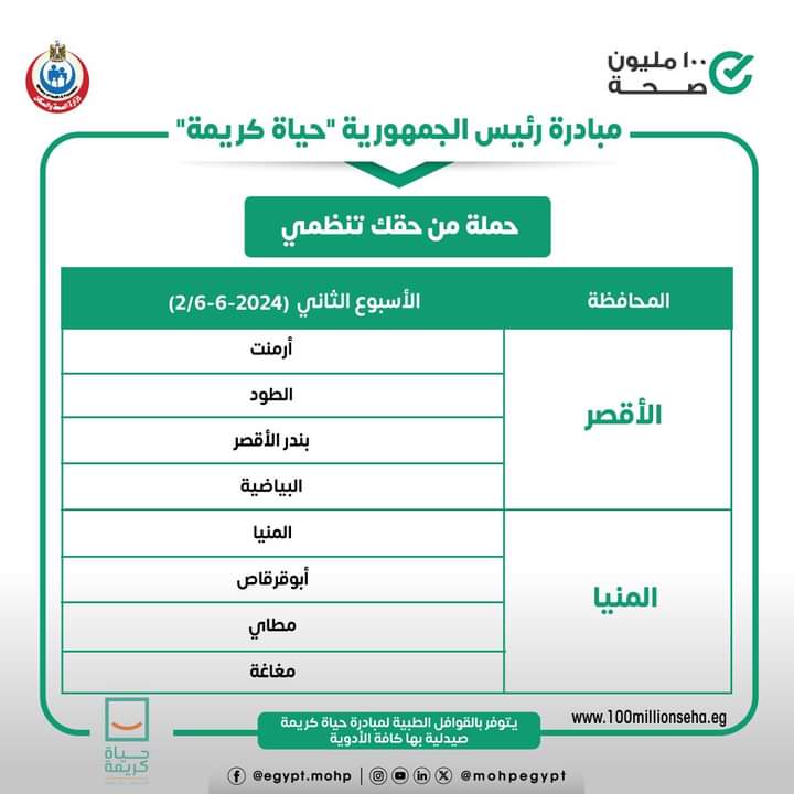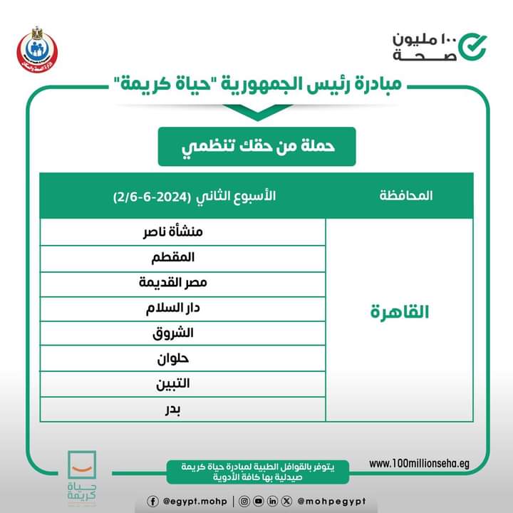 كشفت وزارة الصحة عن خريطة أماكن القوافل الطبية التابعة لحملة من “حقك تنظمي”في الأسبوع الثاني، ضمن مبادرة رئيس الجمهورية حياة كريمة المنتشرة بالمحافظات