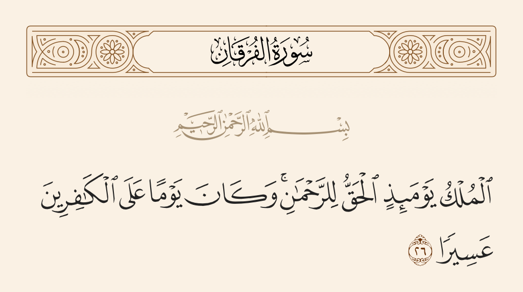 قال تعالى: «الْمُلْكُ يَوْمَئِذٍ الْحَقُّ لِلرَّحْمَنِ وَكَانَ يَوْمًا عَلَى الْكَافِرِينَ عَسِيرًا».