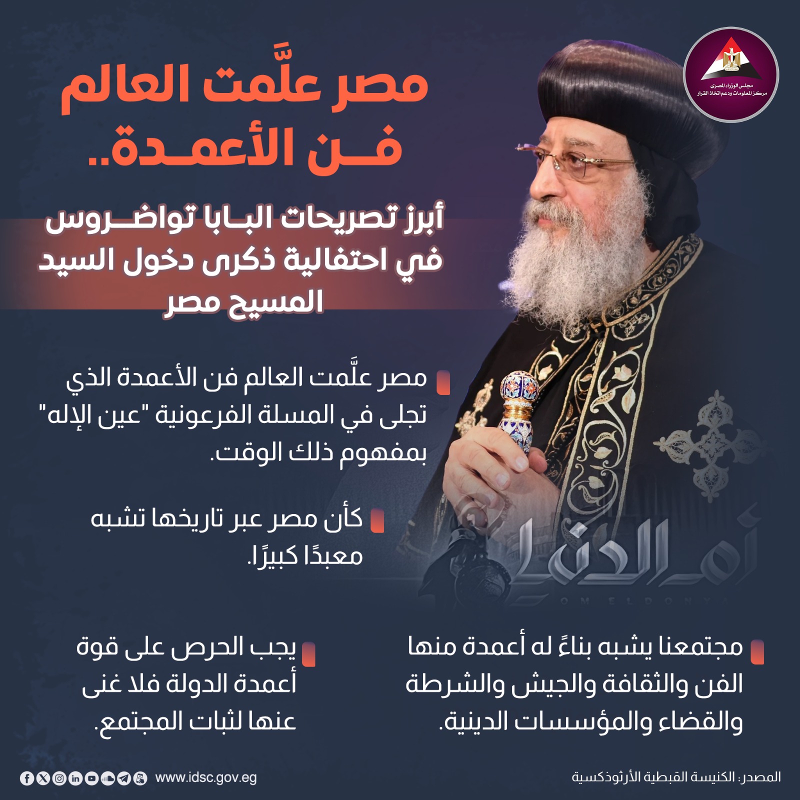 سلط مركز المعلومات ودعم اتخاذ القرار بمجلس الوزراء الضوء على أبرز تصريحات البابا تواضروس في احتفالية ذكرى دخول السيد المسيح مصر.