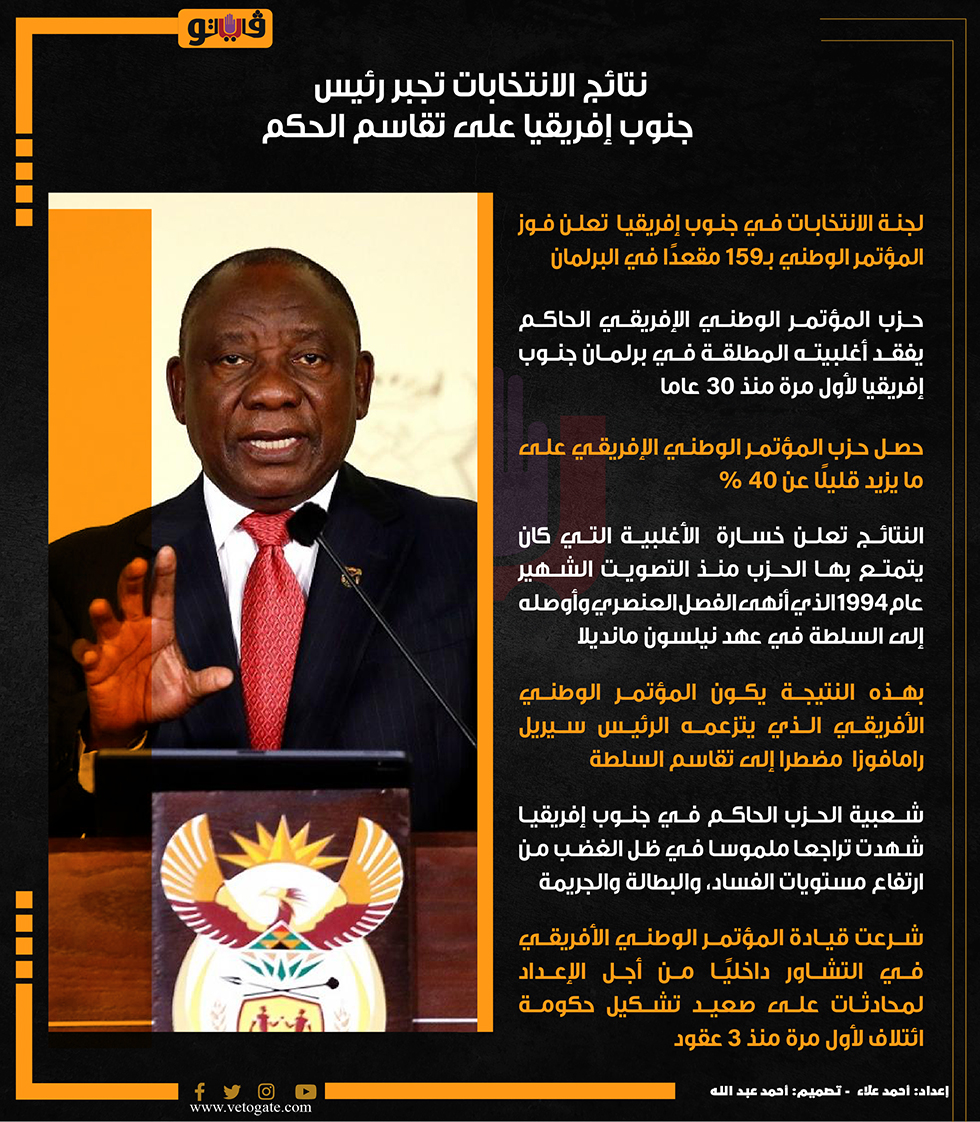 نتائج الانتخابات تجبر رئيس جنوب إفريقيا على تقاسم الحكم (إنفوجراف) الإثنين 03/يونيو/2024 - 12:16 م 6/3/2024 12:16:37 PM رئيس جنوب إفريقيا، فيتو احمد علاء شارك طباعة 18 حجم الخط شارك طباعة جنوب أفريقيا نيلسون مانديلا برلمان جنوب افريقيا انتخابات جنوب إفريقيا سيريل رامافوزا المؤتمر الوطني الإفريقي