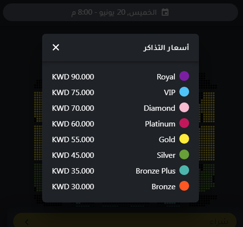 والفئة الثالثة جاءت بسعر 70 ألف دينار كويتي، أما عن الفئة الرابعة 60 ألف دينار كويتي والفئة الخامسة سعرها 55 ألف دينار كويتي أما عن الفئة السادسة سعرها 45 ألف دينار كويتي والفشة السابعة 35 ألف دينار كويتي والفئة الثامنة والأخيرة سعرها 30 ألف دينار كويتي.