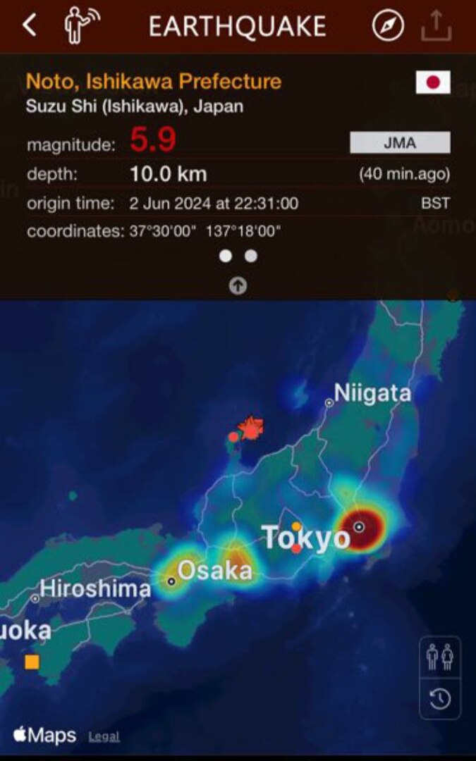 زلزال، أفادت وكالة الأرصاد الجوية اليابانية صباح الإثنين، بوقوع زلزال بقوة 5.9 درجة على مقياس ريختر وسط البلاد، دون تحذيرات من وقوع موجات تسونامي.