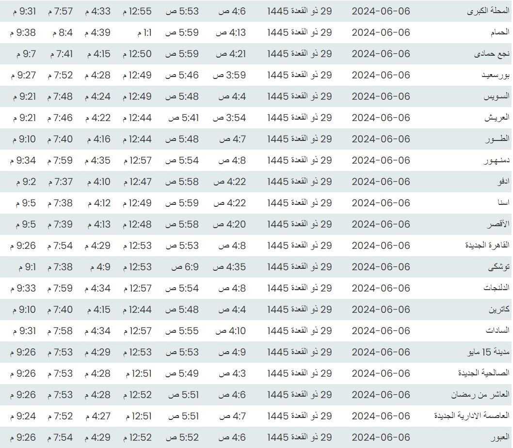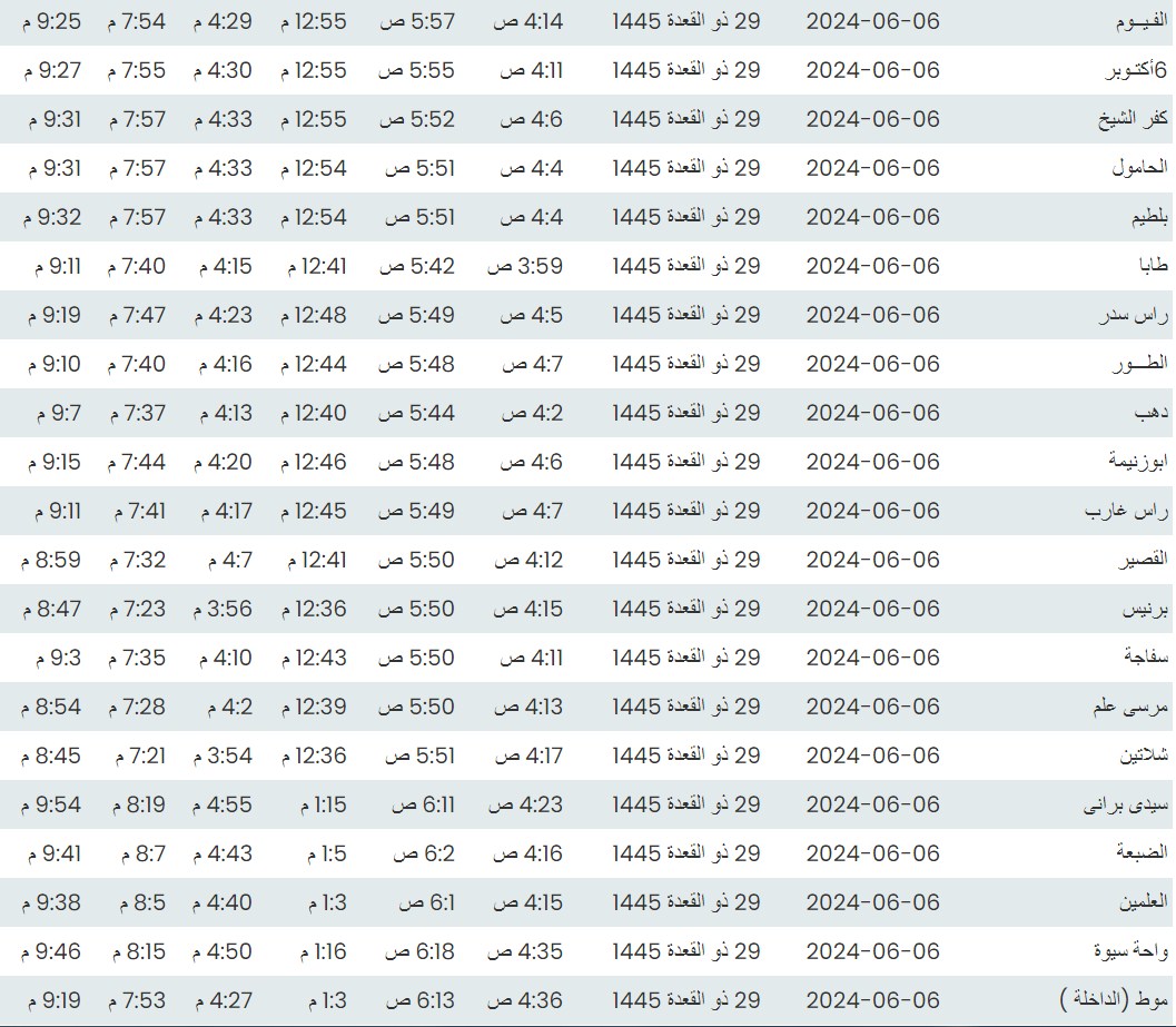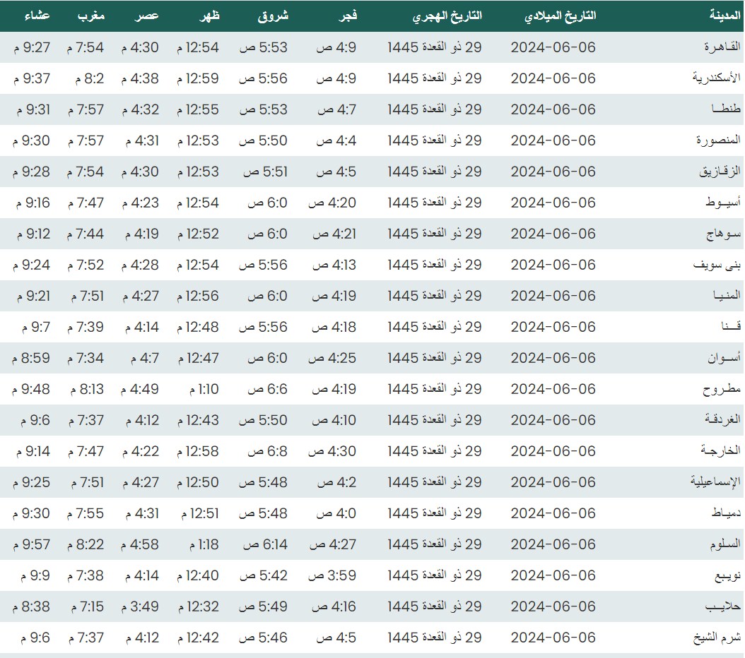 وفيما يلي مواقيت الصلاة، لعدد من مدن ومحافظات الجمهورية من واقع بيانات الهيئة العامة للمساحة