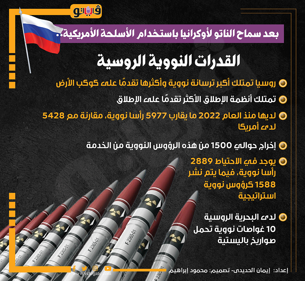 بعد سماح الناتو لأوكرانيا باستخدام الأسلحة الأمريكية.. القدرات النووية الروسية (إنفوجراف) الإثنين 03/يونيو/2024 - 08:05 م 6/3/2024 8:05:35 PM القدرات النووية الروسية، فيتو إيمان الحديدى شارك طباعة 18 حجم الخط شارك طباعة أوكرانيا أمريكا موسكو