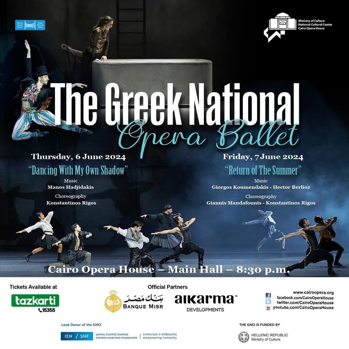 تستضيف دار الأوبرا المصرية برئاسة الدكتورة لمياء زايد لأول مرة فرقة الباليه الوطنى اليونانى لتقديم عرضين متنوعين بالتعاون مع سفارة اليونان ومؤسسة ستافروس نياركوس بمناسبة اليوم الوطني لجمهورية اليونان، وذلك في الثامنة والنصف مساء الخميس والجمعة 6، 7 يونيو علي المسرح الكبير.