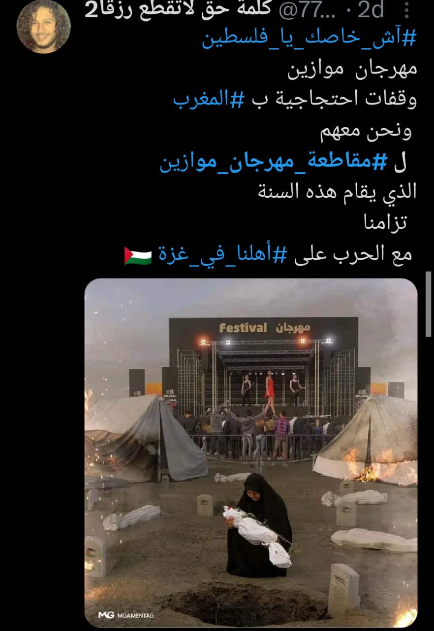 تصدرت "هشتاجات" عديدة مواقع التواصل الاجتماعي المختلفة وعلى رأسها "X" و"فيسبوك" تطالب بمقاطعة مهرجان موازين المغربي.