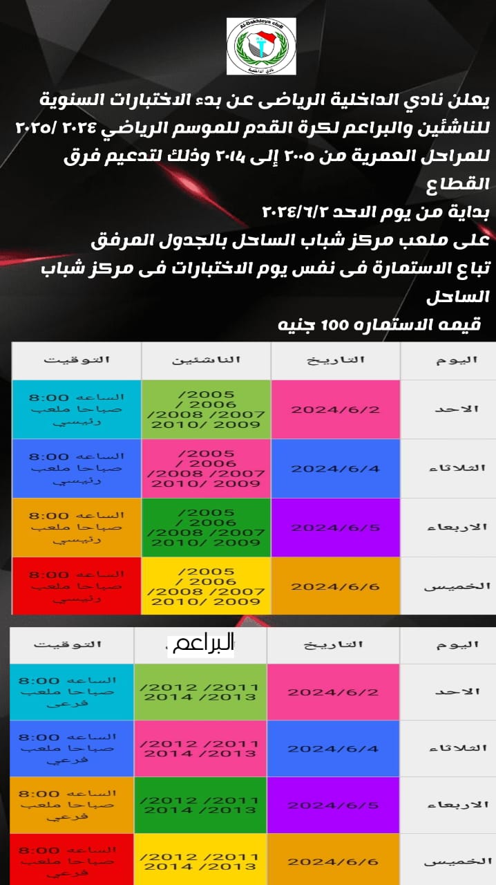 وتقام اختبارات الناشئين بنادي الداخلية غدا الثلاثاء لجميع المواليد الساعه 10 صباحا بمركز شباب الساحل.