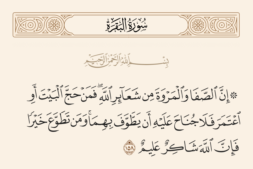 قال تعالى: «إِنَّ الصَّفَا وَالْمَرْوَةَ مِنْ شَعَائِرِ اللَّهِ فَمَنْ حَجَّ الْبَيْتَ أَوِ اعْتَمَرَ فَلَا جُنَاحَ عَلَيْهِ أَنْ يَطَّوَّفَ بِهِمَا وَمَنْ تَطَوَّعَ خَيْرًا فَإِنَّ اللَّهَ شَاكِرٌ عَلِيمٌ».