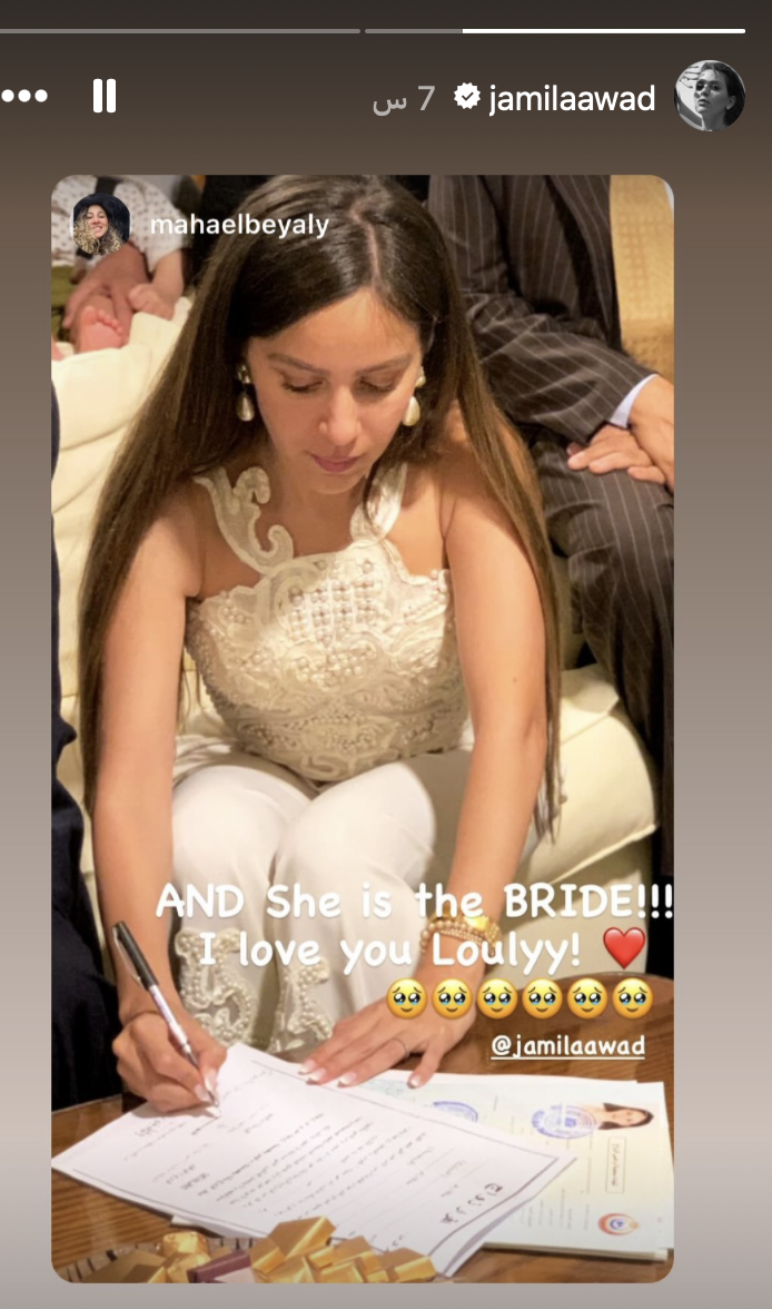 أعادت الفنانة الشابة جميلة عوض نشر “ستوري” عبر حسابها على موقع تبادل الصور انستجرام تكشف عن صورة لها أثناء عقد قرانها، وارتدت جميلة “جمبسوت” أبيض.
